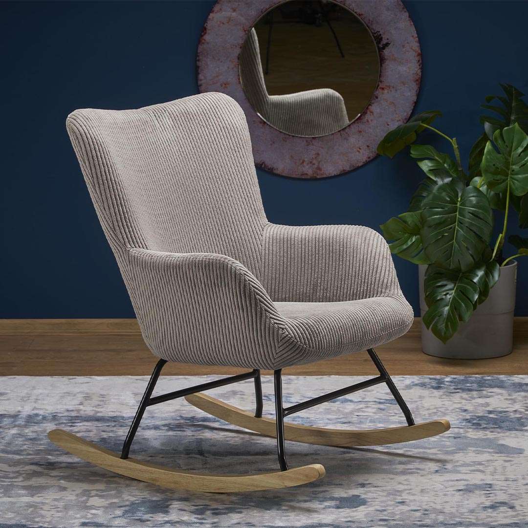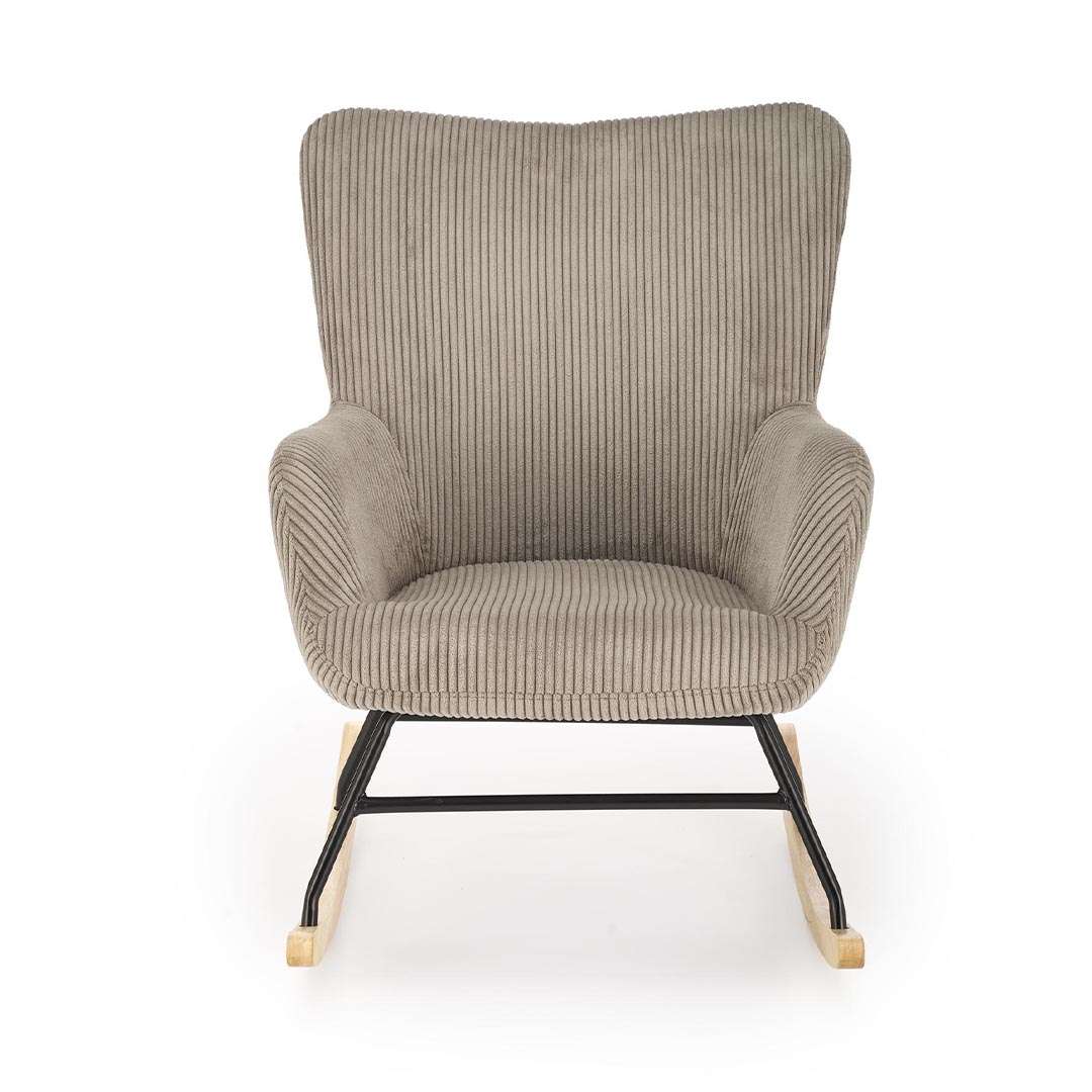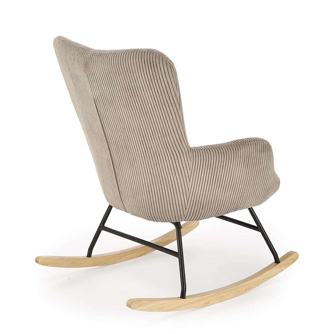 Dizajni i saj mbështetet mbi një strukturë solide metalike të zezë, e cila lidhet me këmbët e metalit të zi me drurin e çelët. Kjo bazë jo vetëm që garanton një lëkundje të sigurt dhe të ekuilibruar, por shton edhe një detaj estetik të sofistikuar. Mbështetësja e lartë ofron suport të plotë për kokën dhe qafën, duke e bërë atë vendin ideal për të lexuar një libër ose për të vënë në gjumë fëmijën.