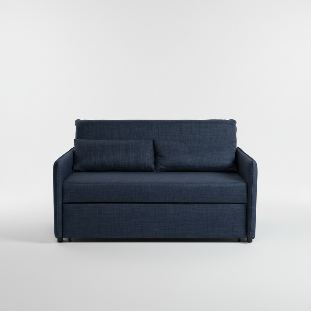 Në pamje të parë, Alex është një divan modern kompakt me krahë të hollë që kursejnë vend, i veshur me një pëlhurë të endur në ngjyrë blu të thellë (Navy). Por me një lëvizje të thjeshtë, pjesa e poshtme tërhiqet dhe ngrihet lart për t'u bërë një krevat i gjerë dhe i rehatshëm për dy persona.