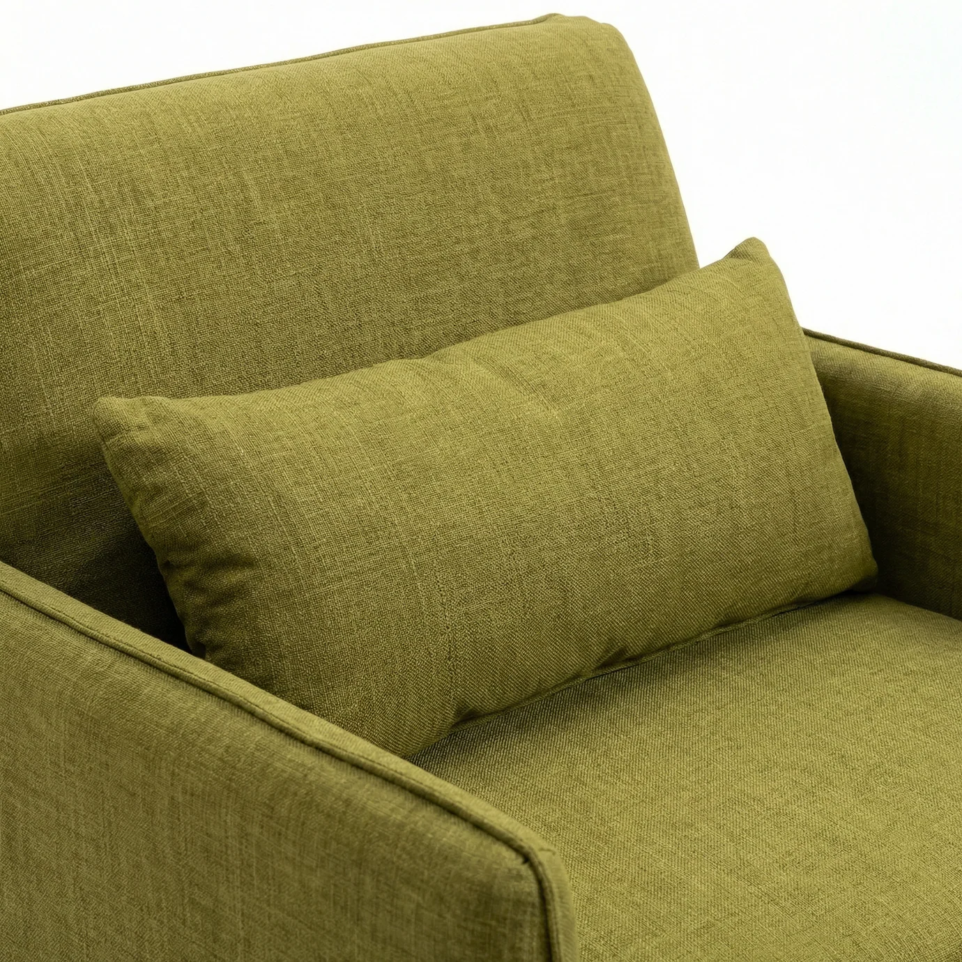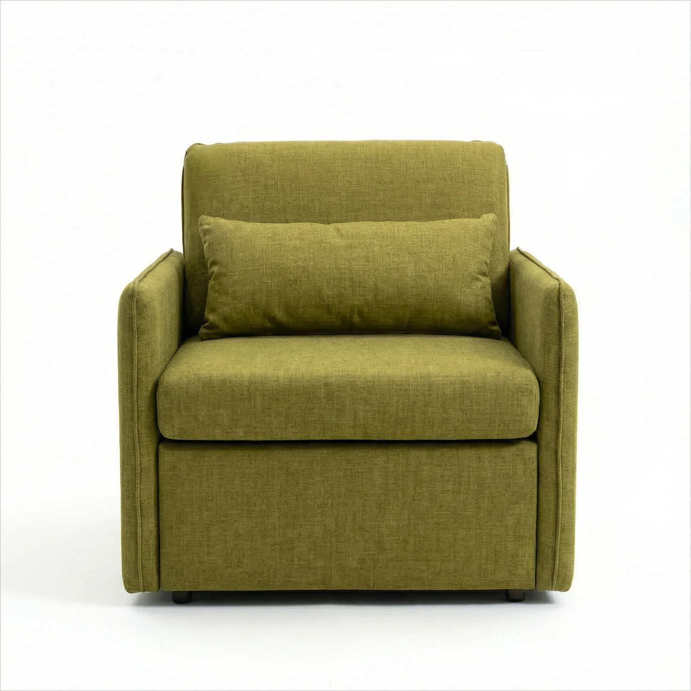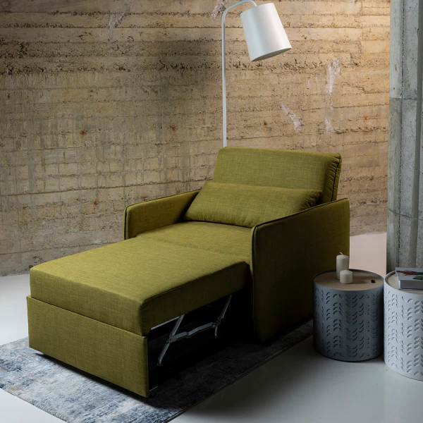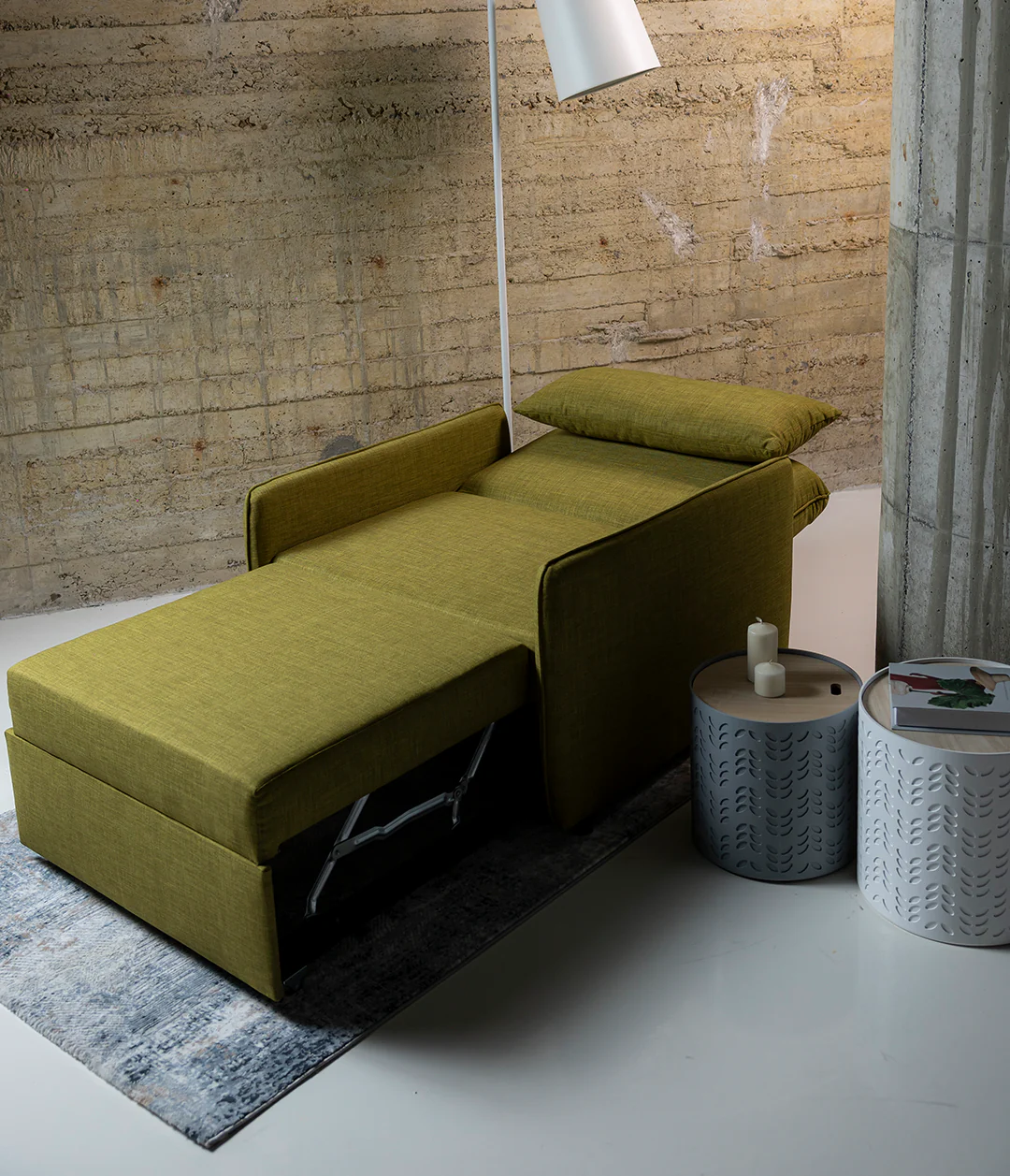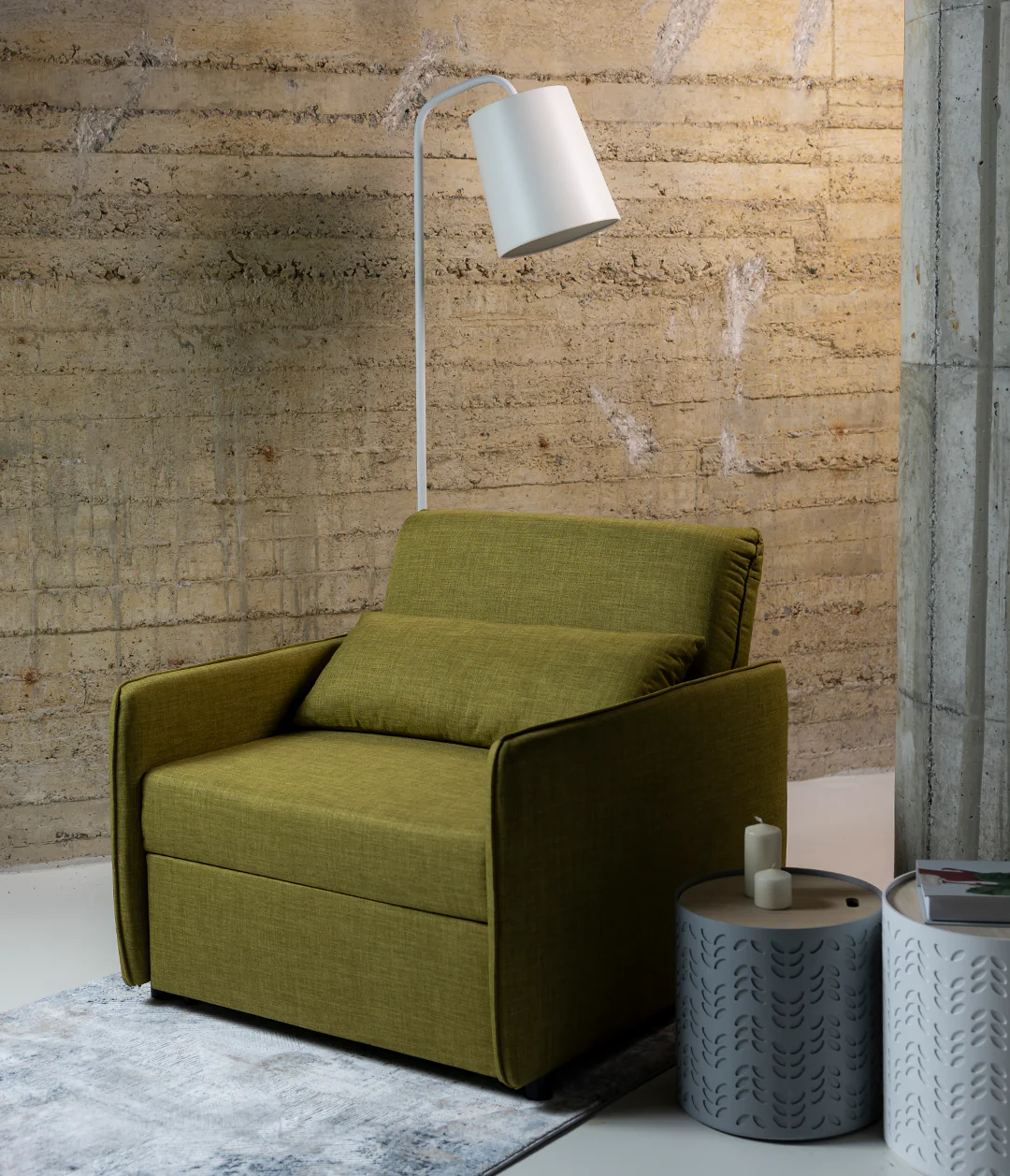 Në gjendjen e mbyllur, Alex është një poltronë moderne dhe komode leximi, e veshur me një pëlhurë cilësore në ngjyrë jeshile ulliri (Olive Green) që shton një notë natyrale dhe qetësuese në ambient. Me një lëvizje të thjeshtë, ajo transformohet në një shtrat tek (single) të plotë, falë mekanizmit të saj të fortë metalik që rrëshqet përpara.
