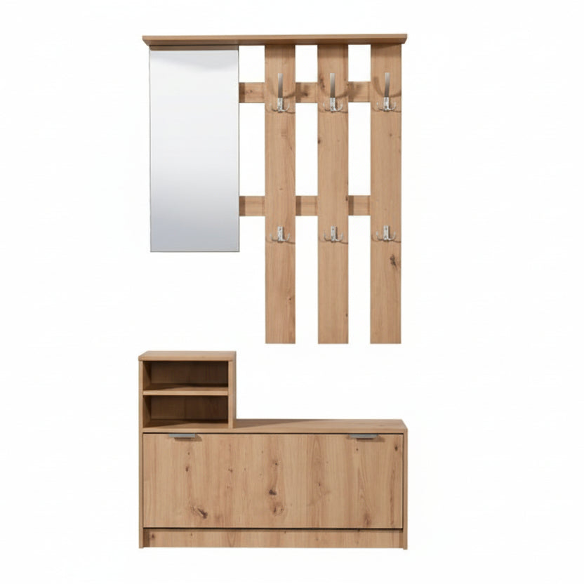 Panel Muri me Pasqyrë: Pjesa e sipërme, e cila montohet në mur, përbëhet nga panele druri vertikale të pajisura me grepa të fortë metalikë për varjen e xhaketave, palltove dhe çantave. Kjo pjesë përfshin gjithashtu një pasqyrë vertikale, thelbësore për një kontroll të fundit të pamjes suaj para se të dilni.