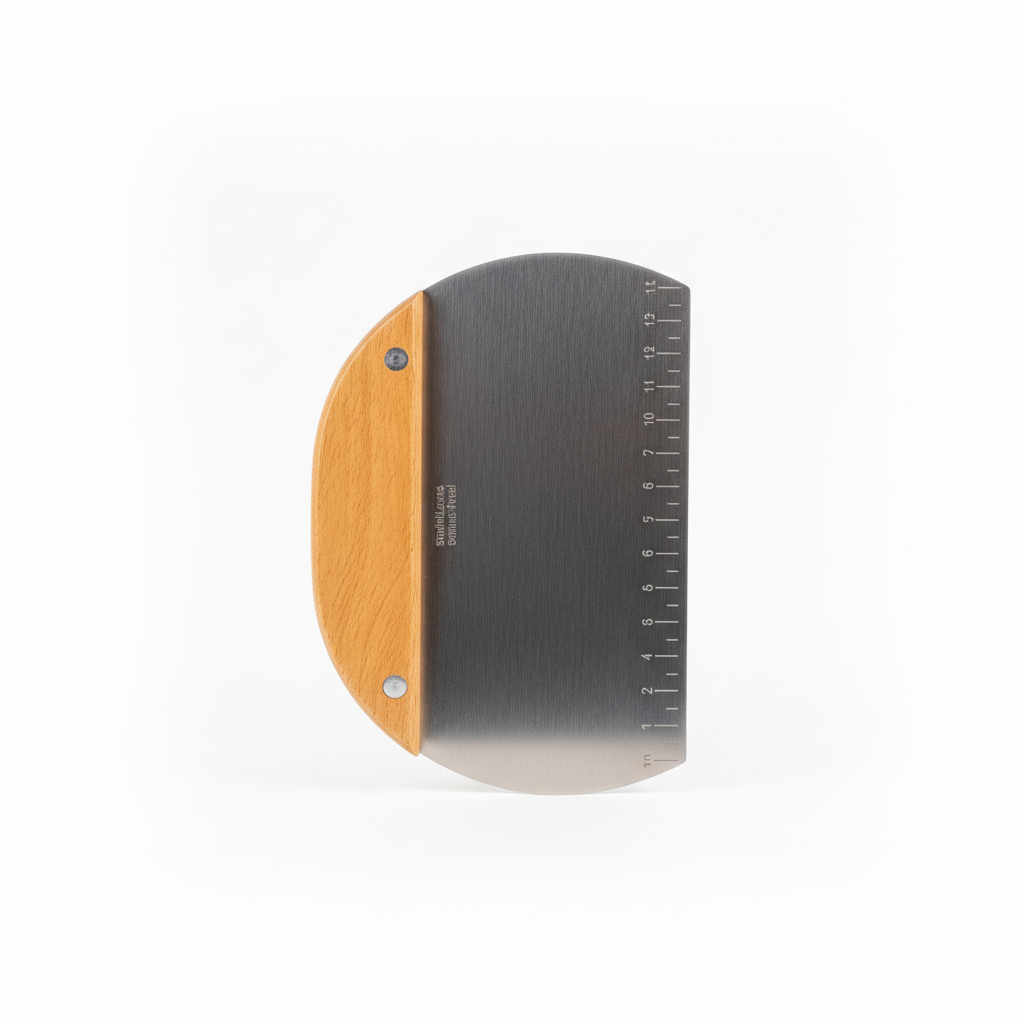 Prerëse praktike brumi me teh inoksi dhe dorezë druri, ideale për përgatitjen e brumit dhe ëmbëlsirave. Dizajni ergonomik siguron përdorim të rehatshëm dhe prerje të sakta.