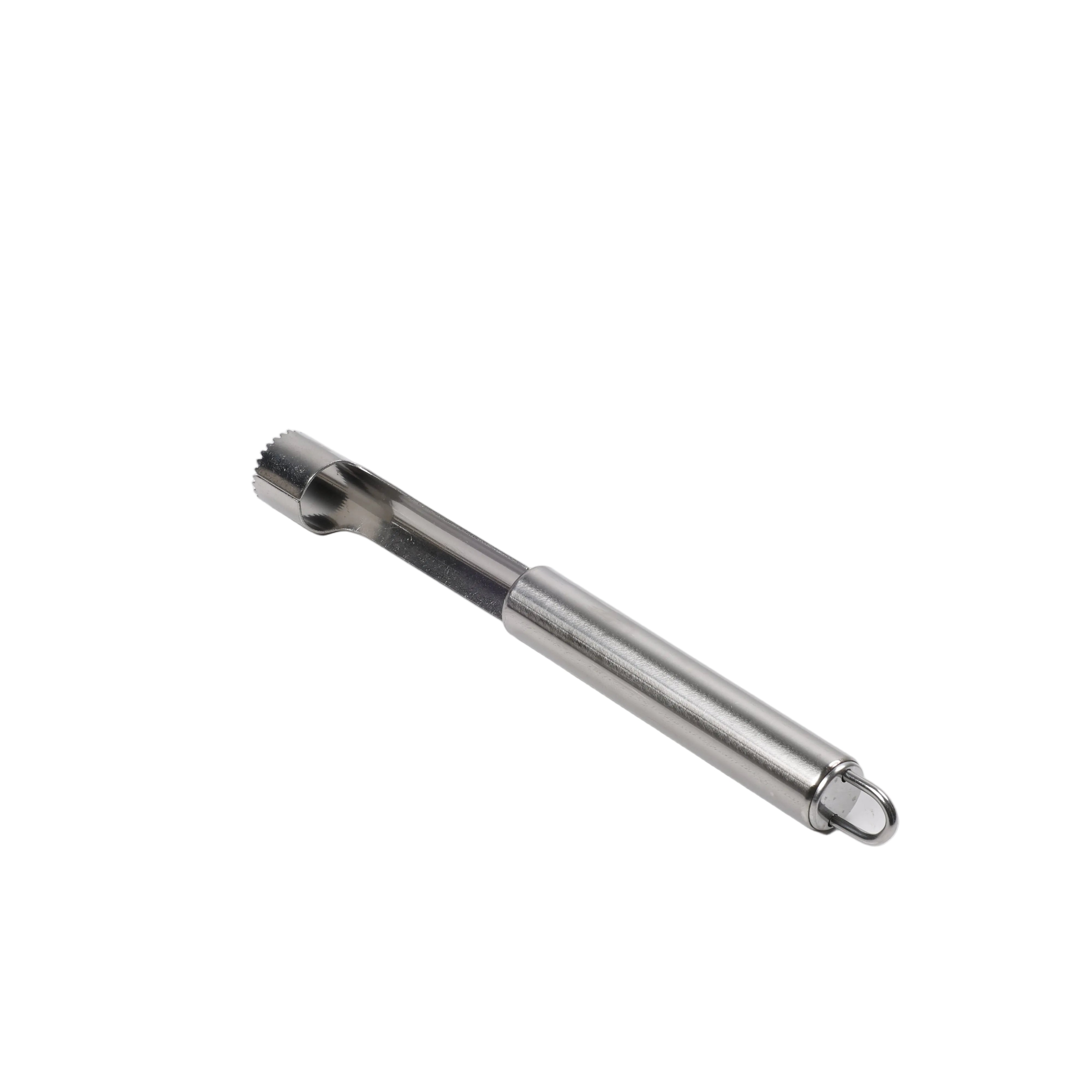 Kjo qëruese molle prej çeliku inox është një mjet i domosdoshëm për përgatitjen e frutave dhe perimeve në kuzhinë. Dizajni i thjeshtë dhe funksional me dhëmbë metalikë lejon heqjen e lëvores në mënyrë të shpejtë dhe efikase, pa dëmtuar tulin.