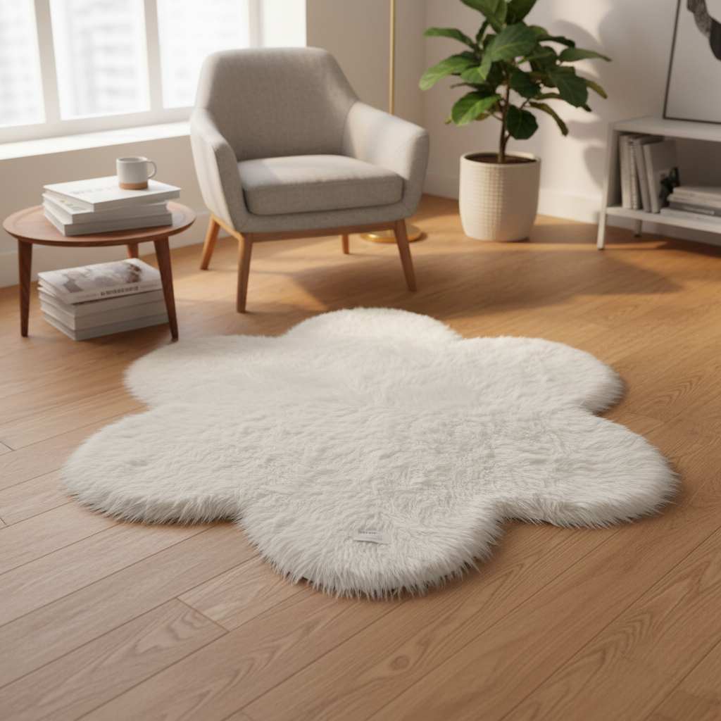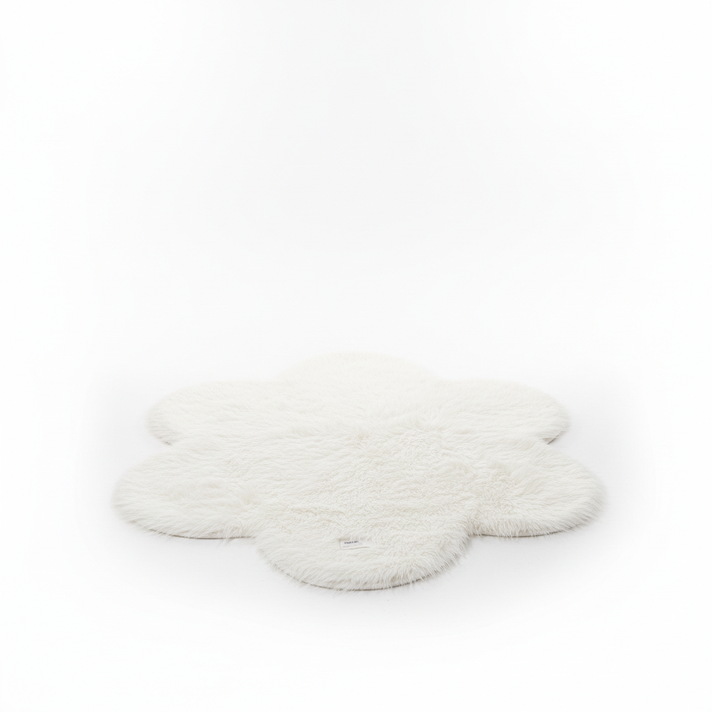 Qilim i bardhë me push sintetik, në formë luleje dekorative që sjell pamje të këndshme dhe komode në çdo hapësirë të brendshme.