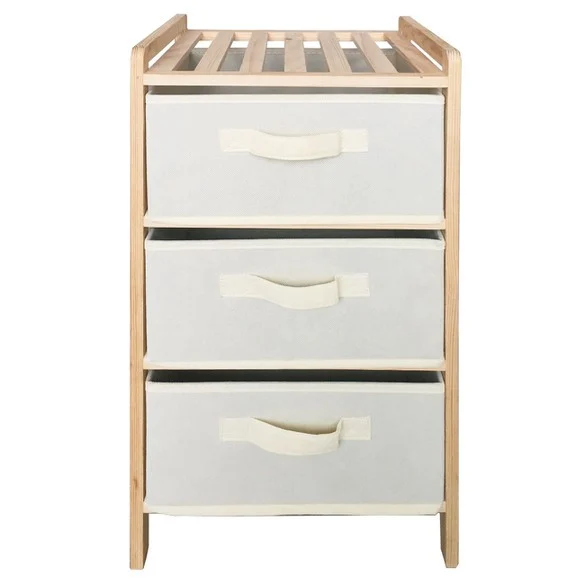 Raft banjo me 3 vende - komodë. Ka një kornizë druri (MDF) me një raft në pjesën e sipërme dhe 3 sirtarë pëlhure me një dorezë.