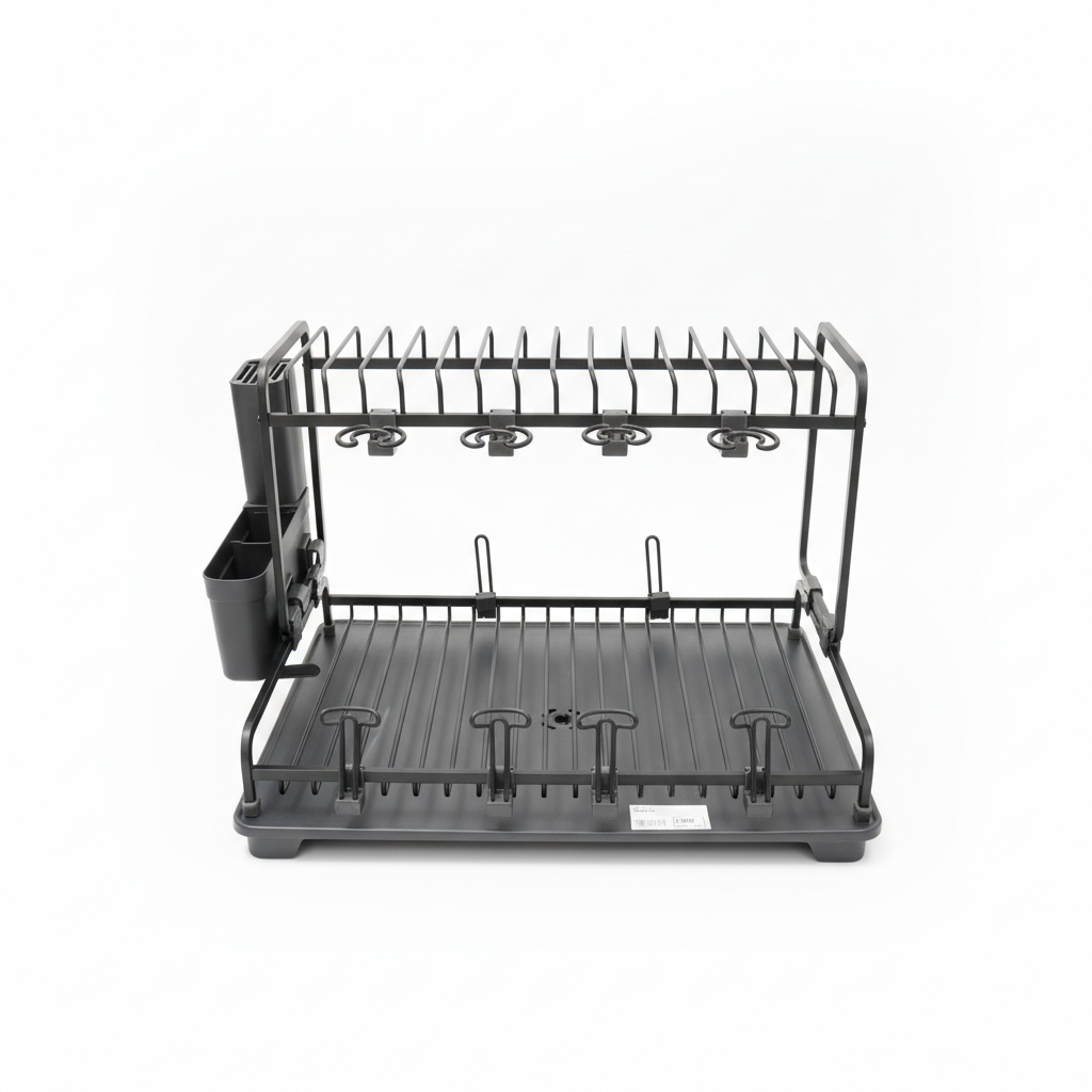 Mbani banakun të pastër dhe të organizuar me këtë raft enesh metalik, i cili kombinon tharjen efikase me ruajtjen inteligjente të enëve të përditshme. Konstruksioni i fortë me përfundim të errët i jep kuzhinës një pamje moderne, ndërsa tabaka plastike e lëvizshme mban ujin e tepërt larg banakut. Dizajni me vrima të integruara për pjata, mbajtëse anësore për lugë e pirunë dhe grepër për filxhanë apo gota ju ndihmon të shfrytëzoni maksimalisht hapësirën. Këmbët antirrëshqitëse sigurojnë stabilitet edhe kur rafti është plot.