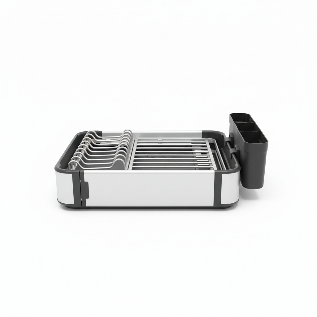 Ky raft enesh mbi banak me konstruksion prej alumini ofron tharje të shpejtë dhe të rregullt të pjatave, gotave dhe enëve të përditshme, duke kursyer hapësirë në kuzhinë. Dizajni i tij kompakt drejtkëndor përshtatet lehtësisht pranë shumicës së lavamanëve, ndërsa tabakaja rrethuese mban ujin e tepërt larg banakut.