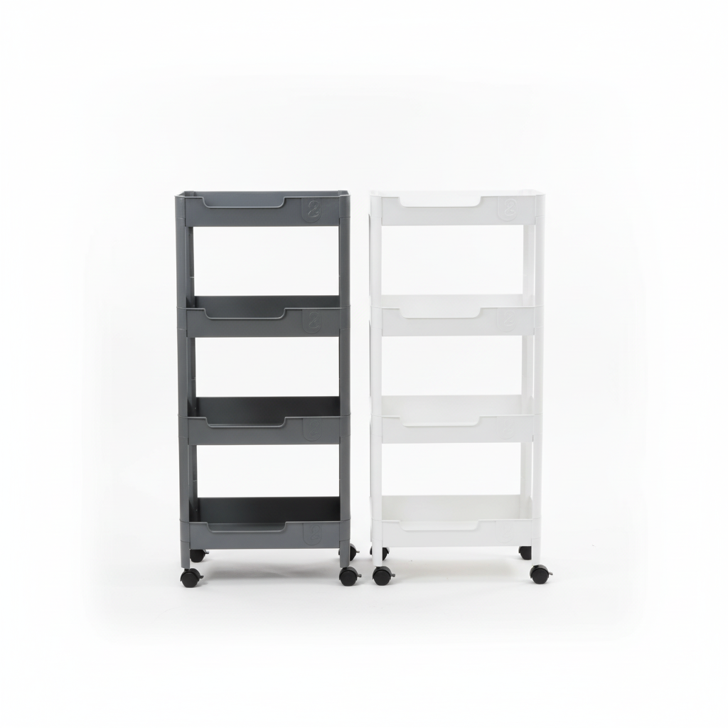 Karrocë praktike me 4 kate për organizimin e sendeve në banjo, kuzhinë ose zyrë, me dizajn të hollë vertikal që përshtatet lehtësisht edhe në hapësirat e ngushta.