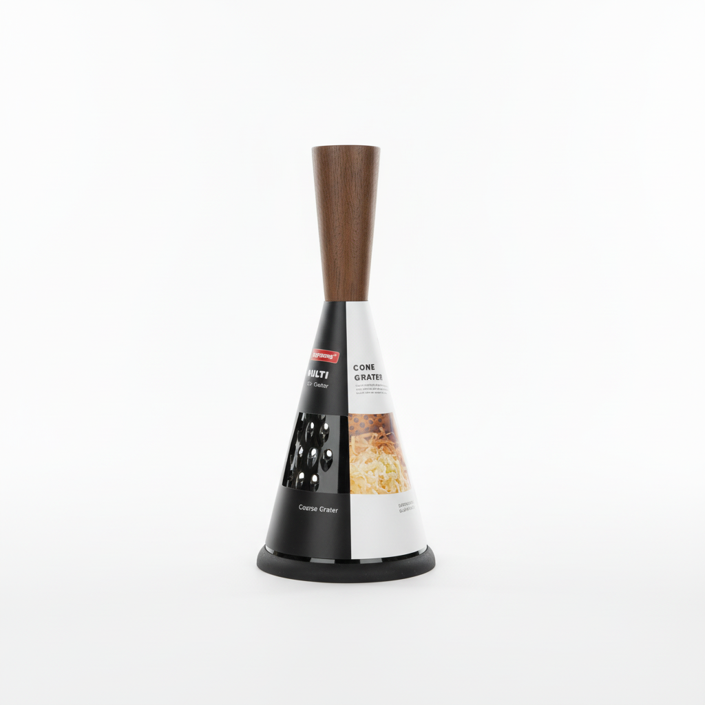 Rende praktike kuzhine me formë konike, sipërfaqe të trashë dhe dorezë druri për përdorim të rehatshëm, ideale për djathë dhe ushqime të ngjashme. E prodhuar në Kinë, ofron stabilitet falë bazës antirrëshqitëse.