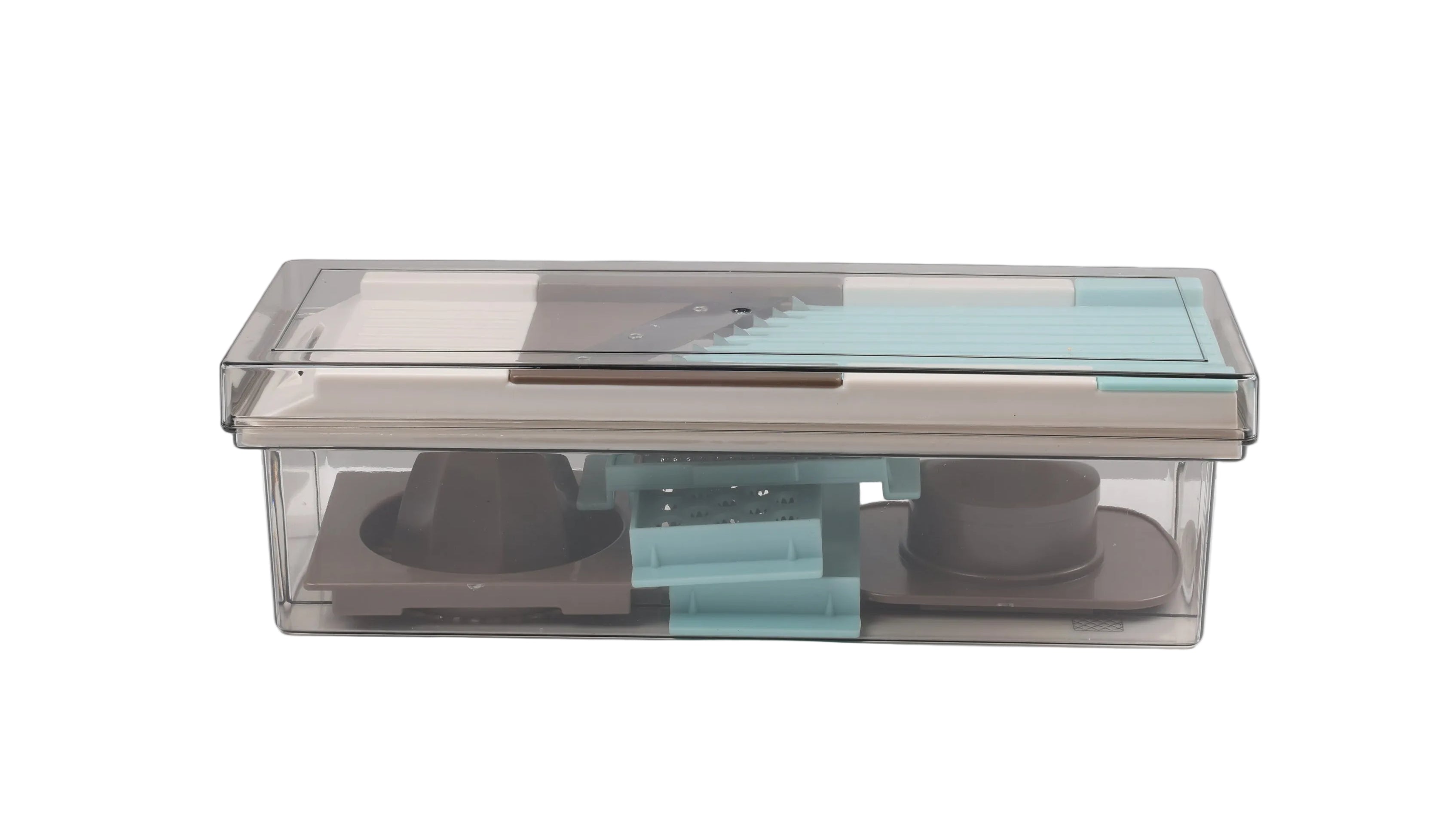 Set praktik për prerje dhe rende të shpejtë të perimeve dhe frutave, ideal për përdorim të përditshëm në kuzhinë. Dizajn kompakt me kuti ruajtëse, që mban gjithçka të organizuar dhe të pastër.