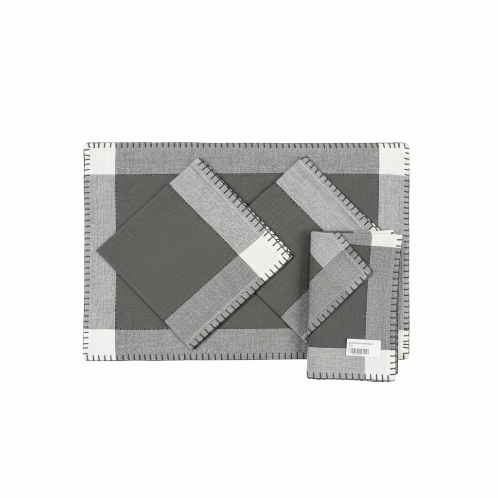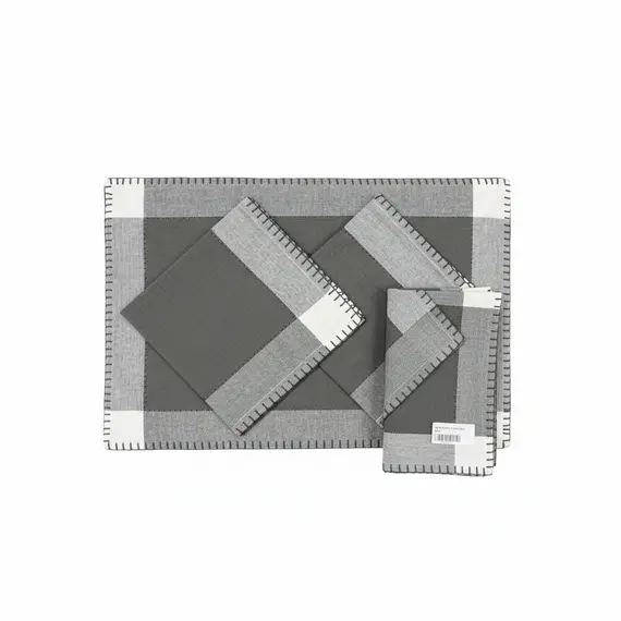 Set tekstilesh tryeze NUKA Home me 2 peceta dhe 2 tapeta në nuanca gri, ideal për të shtuar stil dhe rregull në shtrimin e tavolinës.