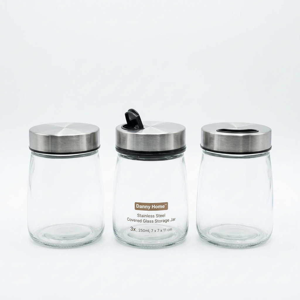 Set 3 Kavanozë Qelqi me Kapak Inoksi Danny Home 250 ml për Kuzhinë