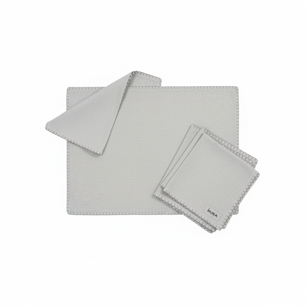 Set eleganti me 4 nape dhe 4 nënpjata në ngjyrë gri të çelët, i paketuar si set i koordinuar për një tryezë të rregullt dhe moderne. Detajet dekorative të qepjes i japin një përfundim të pastër dhe estetik.