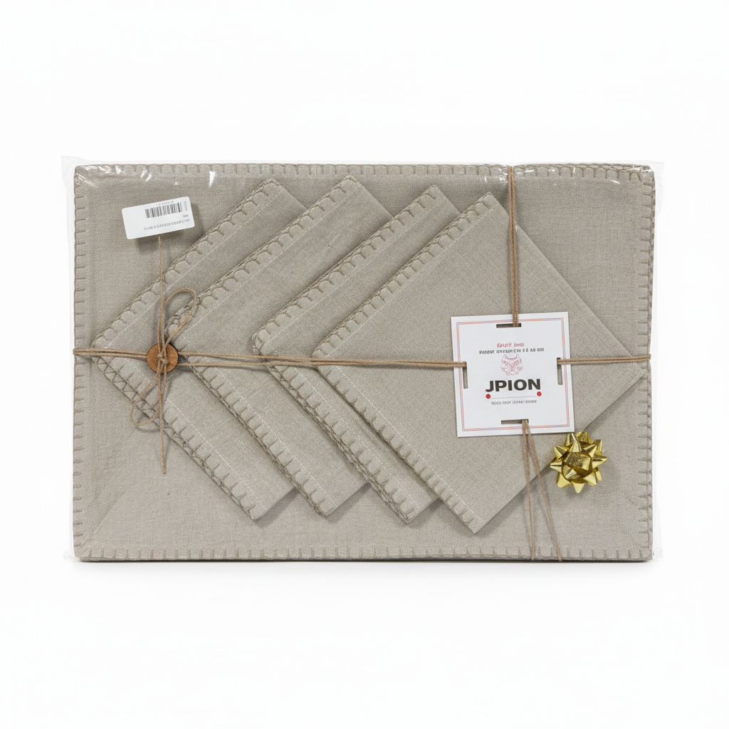Ky set tekstilesh tavoline prej materiali stof sjell një nuancë të butë gri neutrale dhe qepje dekorative rreth skajeve, ideale si për darka familjare ashtu edhe për raste të veçanta. Paketimi me lidhje prej shkumësi e bën gati për t’u dhuruar, duke shtuar një prekje të ngrohtë dhe të kuruar me stil.