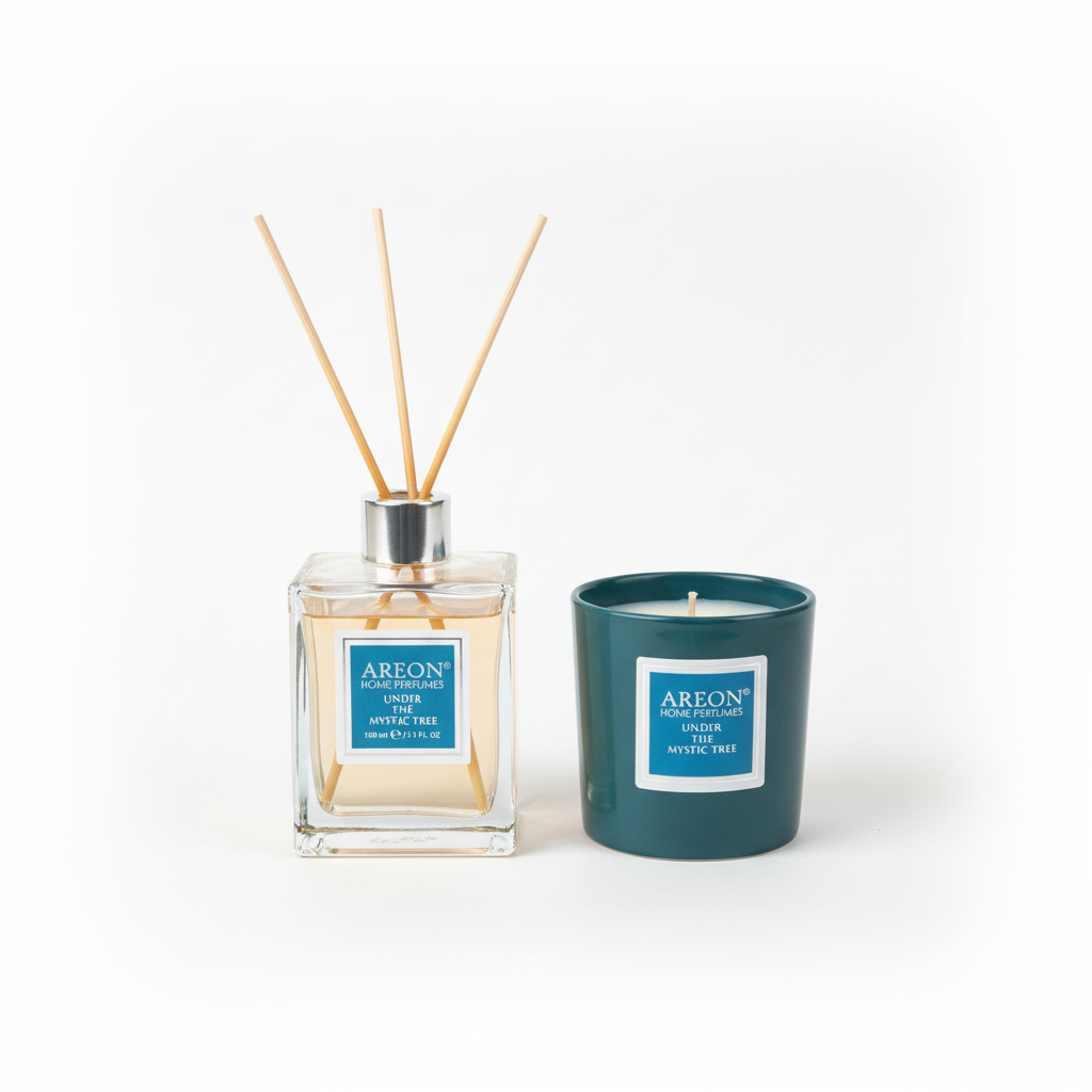 Set aromatizues shtëpie AREON me aromën Under the Mystic Tree, i përbërë nga difuzor me shkopinj dhe qiri i parfumuar, i paketuar në kuti dhurate.