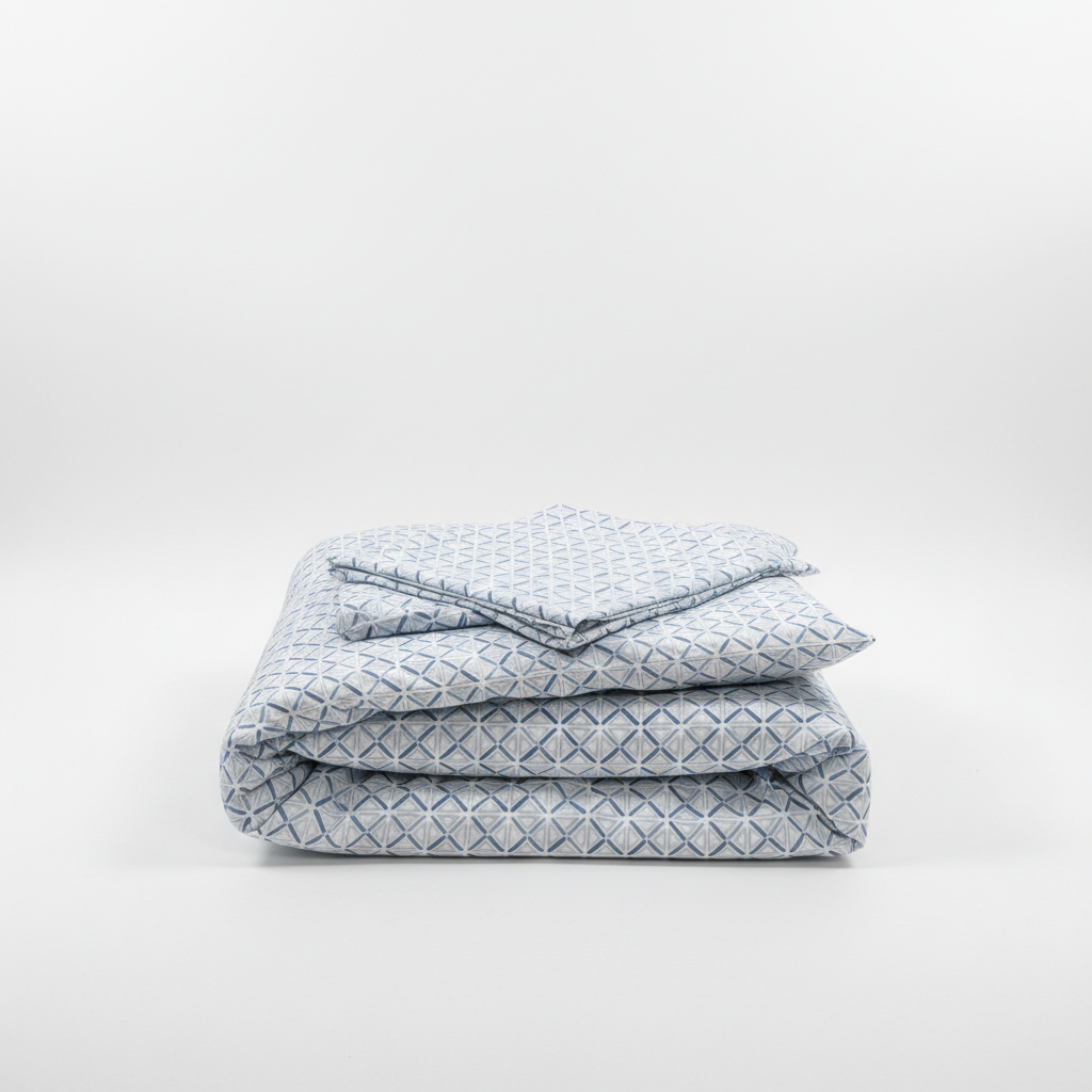 Set tekstilesh krevati KOM.DAROFF “BAMBOO SOFT” me model elegant gjeometrik në nuanca blu mbi sfond të hapur, i përshtatshëm për t’i dhënë stil modern dhomës së gjumit.