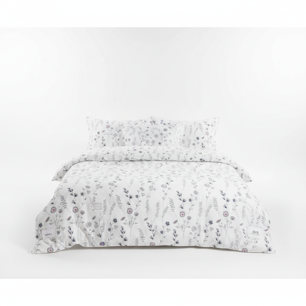 Ky set carçafësh me motiv lulesh sjell një pamje të freskët dhe elegante në dhomën e gjumit, me dizajn delikat në nuanca gri dhe rozë mbi sfond të çelët.