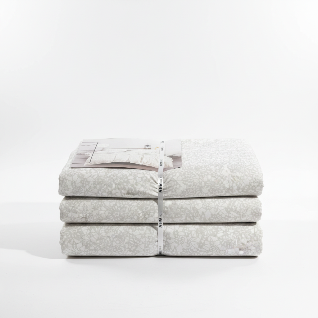 Set elegant mbulesash krevati me motiv floral në ngjyrë të hapur, i prezantuar në kuti dhuratë të markës Nuva Home. Ideale për t’i dhënë dhomës së gjumit një pamje të pastër dhe të rregullt.