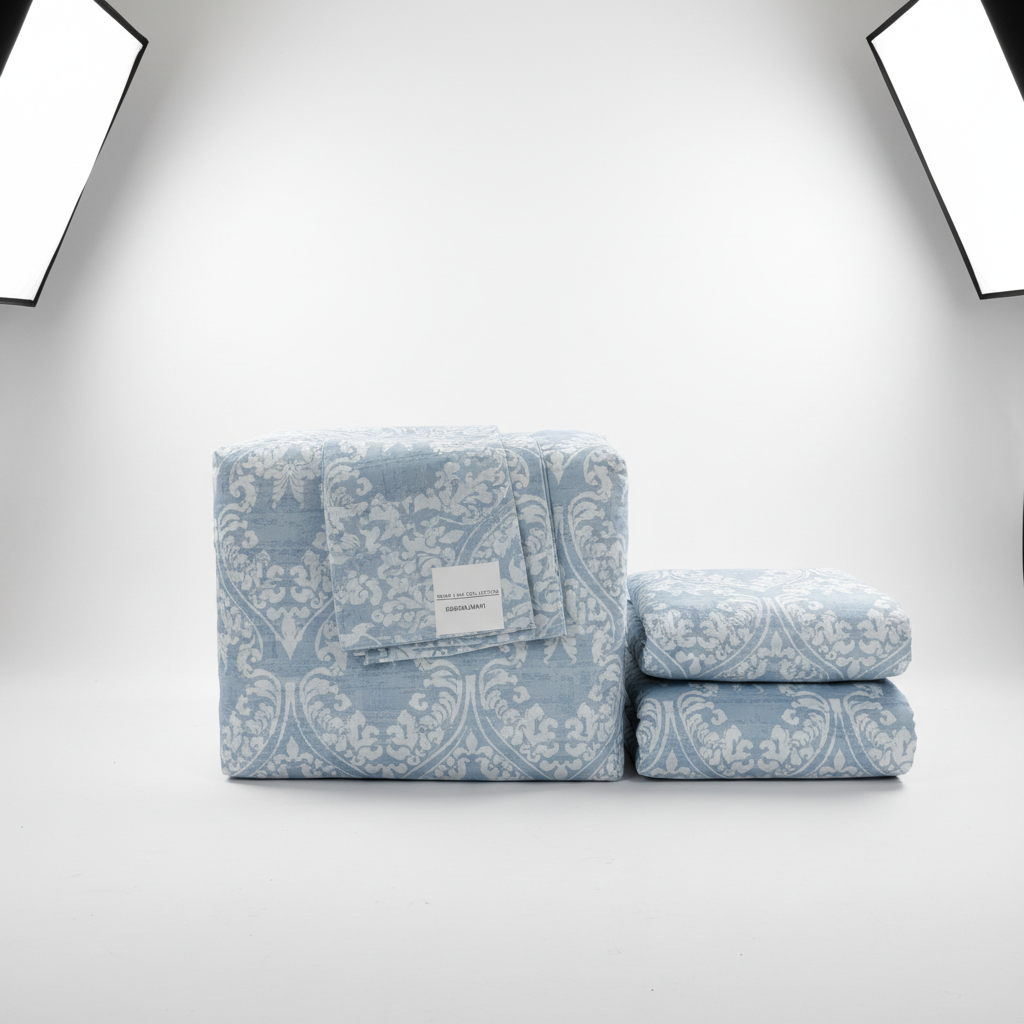 Set çarçafësh bambuje nga Home Line Collection me dizajn dekorativ në ngjyrë blu të lehtë, që i jep dhomës së gjumit një pamje të rregullt dhe elegante. Ideale për ata që kërkojnë një komplet shtrati me model të koordinuar.