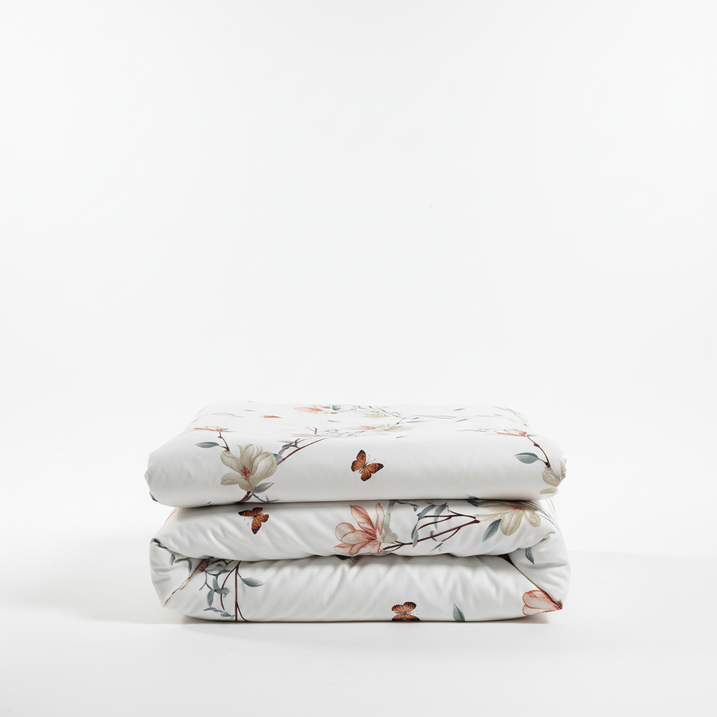 Set mbulesë krevati dyshe 220 x 240 cm me bazë të bardhë dhe dizajn floral me degë dhe gjethe delikate, i përshtatshëm për krevat dopio/queen. Ofron pamje të pastër dhe elegante për dhomën tuaj të gjumit dhe mirëmbajtje të lehtë në përdorim të përditshëm.