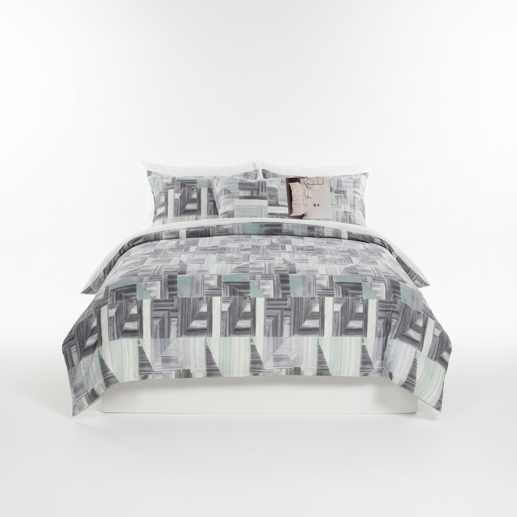 Set çarçafësh me dizajn gjeometrik abstrakt në nuanca gri dhe mente, i përshtatshëm për shtretër të mëdhenj dhe i lehtë për t’u mirëmbajtur.