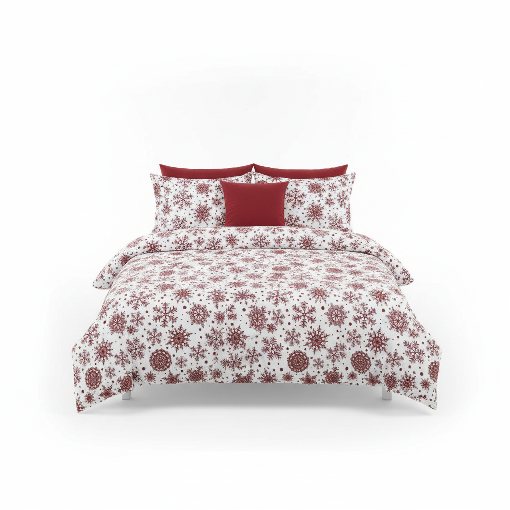 Set mbulesë jorgani dhe jastëkësh me motiv fjokash bore të kuqe mbi sfond të bardhë, i përshtatshëm për shtrat të madh dopio. Dizajni i gëzueshëm dhe ngjyrat kontrast e bëjnë dhomën e gjumit më të ngrohtë dhe festive.