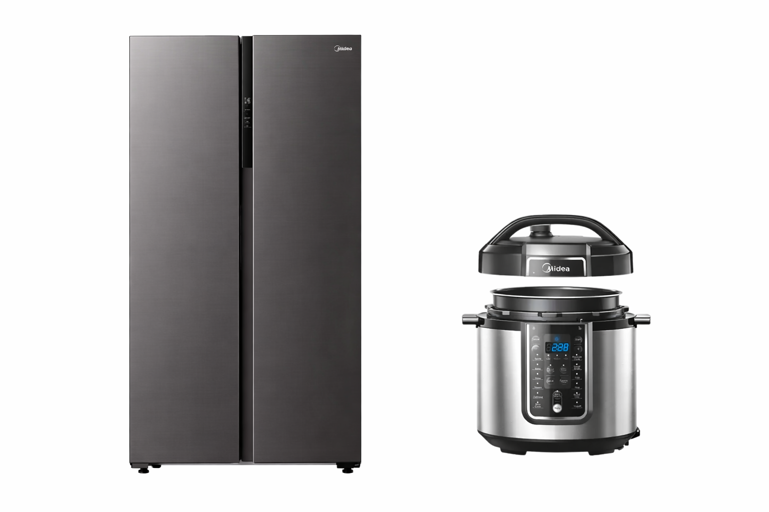 Ky set premium Midea kombinon një frigorifer modern Side by Side Cross Door me teknologji inteligjente dhe një multicooker multifunksional, duke ofruar komoditet maksimal për çdo kuzhinë.