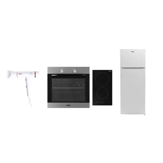 Set i kompletuar me pajisje kuzhine dhe përdorimi të përditshëm, që përfshin furrë inkaso 62L, pianurë qeramike 2 zona, frigorifer 204L me ngrirës 4 yje dhe tharëse flokësh 1600W.