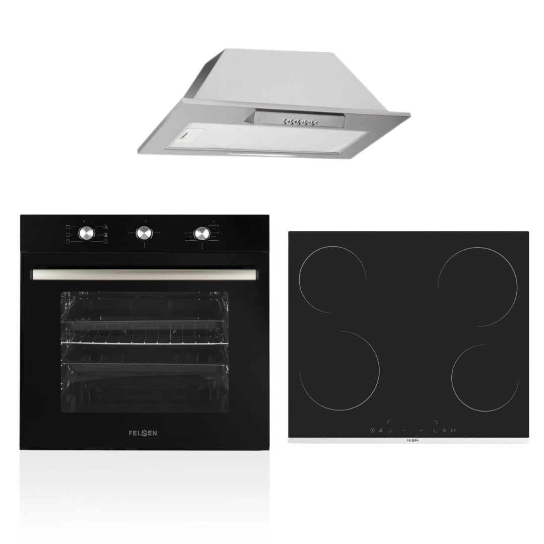 Set i kompletuar Felsen për kuzhinë moderne, i përbërë nga furrë elektrike 71L me ventilim, pianurë qeramike me 4 vatra dhe aspirator full inkaso 60 cm. Zgjidhje praktike dhe elegante për funksionalitet maksimal në gatim.