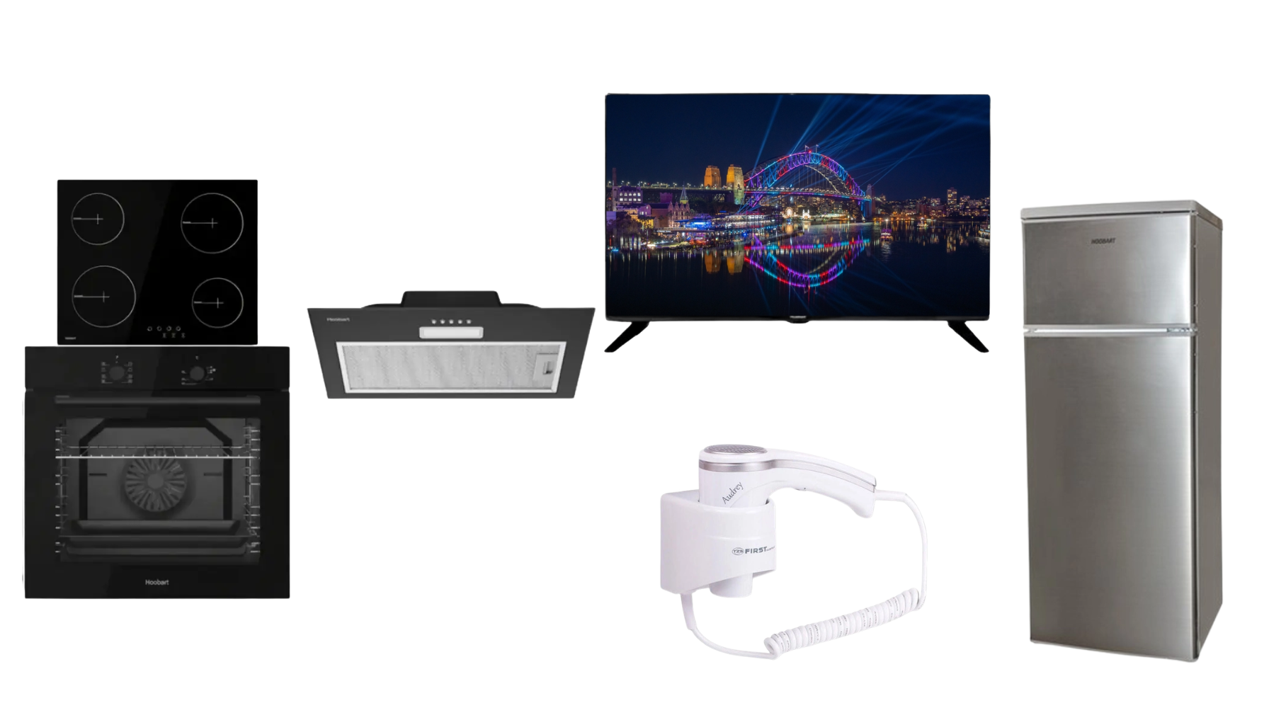 Set Furre Inkaso Hoobart + Suprine 4 Zona + Aspirator 52cm + TV 43" Hoobart Full HD Smart + Frigorifer 212L Hoobart + Tharese Flokesh First Austria
