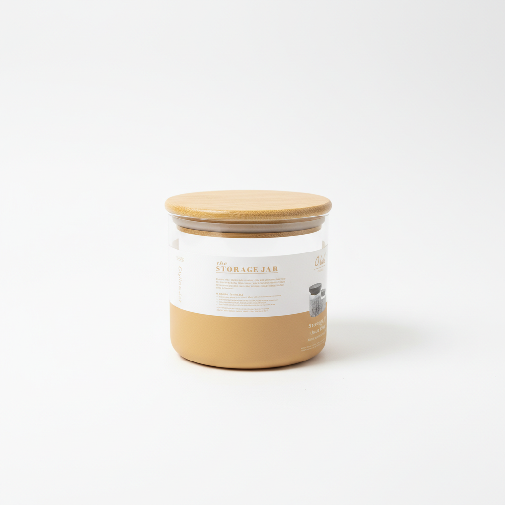 Set praktik kavanozësh ruajtjeje me trupa transparantë, kapakë druri në stil bambuje dhe mbajtëse metalike të bardhë, ideal për makaronat dhe ushqimet e thata. Dizajn klasik me logon O’lala Design për një organizim elegant në kuzhinë.