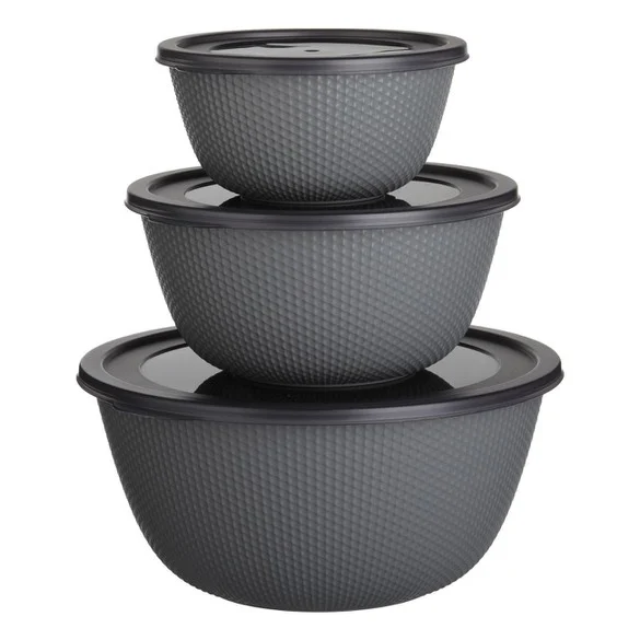 Set prej 3 tasash plastike gri të rrumbullakëta me pika të stampuara në pjesën e jashtme dhe një kapak transparent të akullt. Në madhësi ideale 2lt (21x10cm), 1lt (17x8cm) dhe 0.5lt (13x7cm). Ruhen lehtësisht brenda njëra-tjetrës për më pak hapësirë, kur ruhen brenda njëra-tjetrës, kapakët mbyllen normalisht.