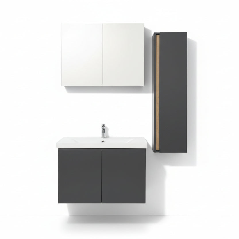 Set Mobilje Tualeti Lavina me Lavaman është një zgjidhje moderne dhe funksionale për ambientin e banjës. Dizajni minimalist në ngjyrë gri, i kombinuar me lavamanin e bardhë, krijon një pamje të pastër dhe elegante, ndërsa hapësira e brendshme ofron vend të mjaftueshëm për organizimin e përditshëm.