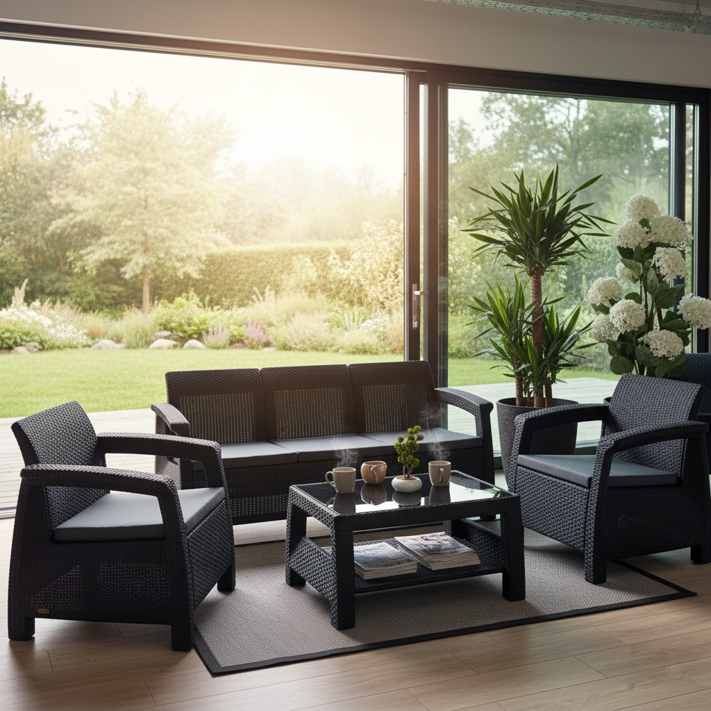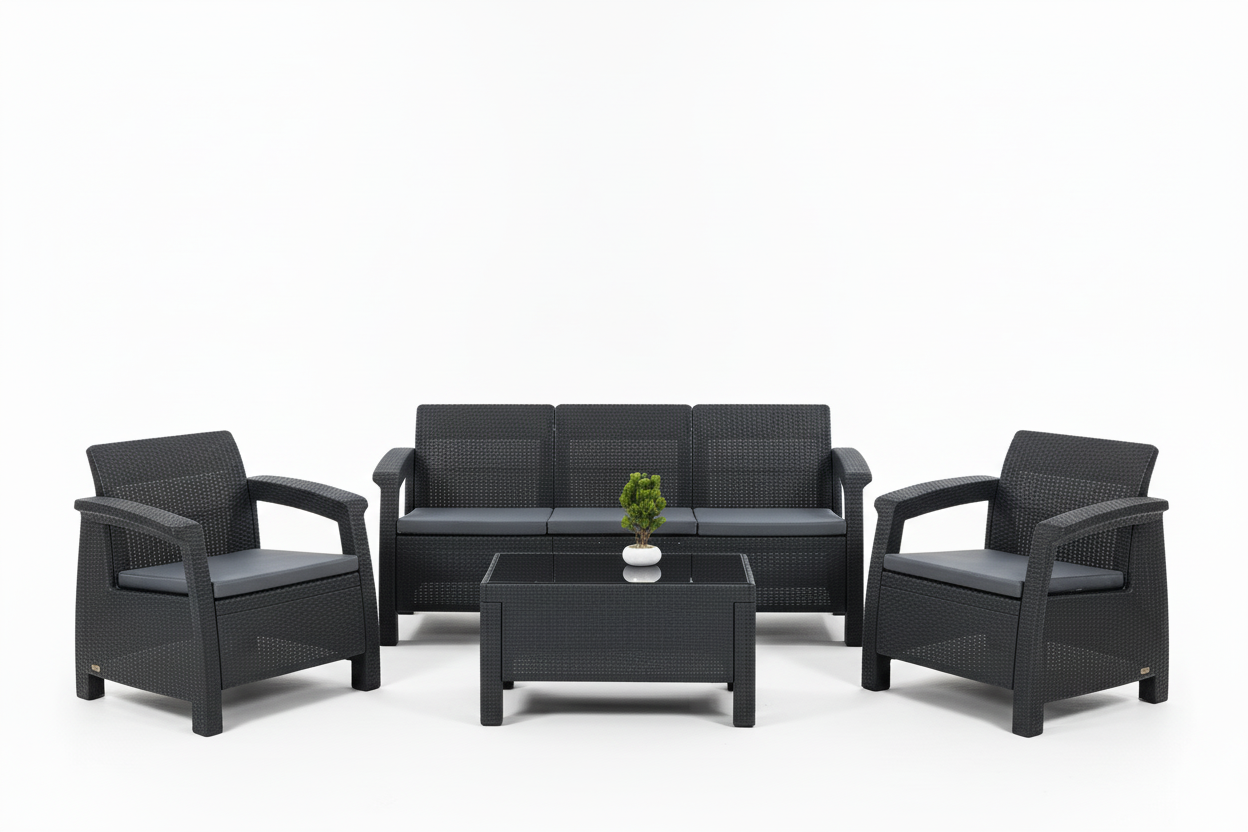 Set i kompletuar mobiljesh për ambientet e jashtme, ideal për verandë ose kopësht, me ngjyrë elegante antracit dhe jastëkë ulës të përfshirë për rehati të përditshme.