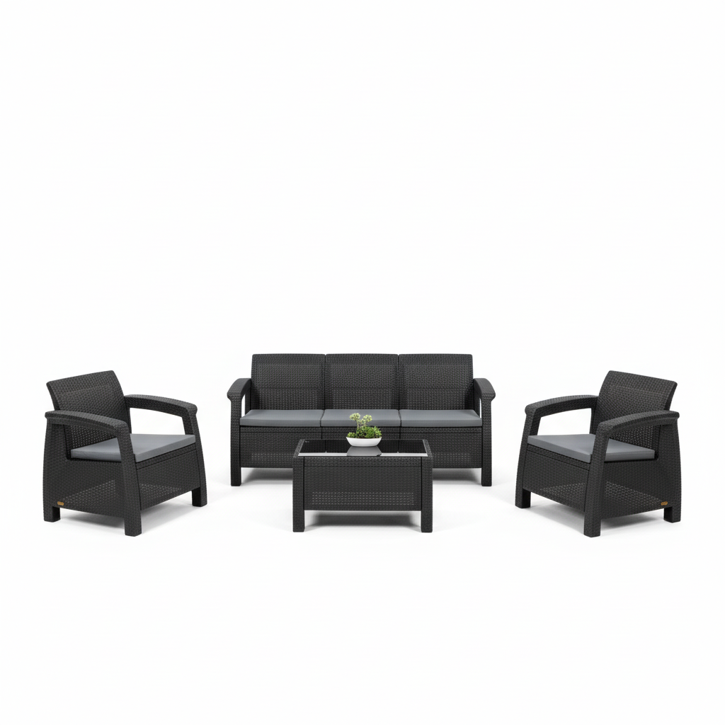 Set komod lounge për ambientet e jashtme me dizajn modern në ngjyrë antracit, me ulëse të rehatshme dhe tavolinë të ulët përshtatëse për verandë, oborr apo tarracë.