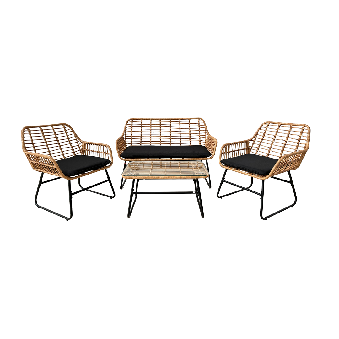 Seti përfshin një divan dyvendësh, dy kolltuqe komode dhe një tavolinë të ulët me sipërfaqe xhami, duke krijuar një ambient të plotë për momente relaksi, kafe apo biseda në natyrë.