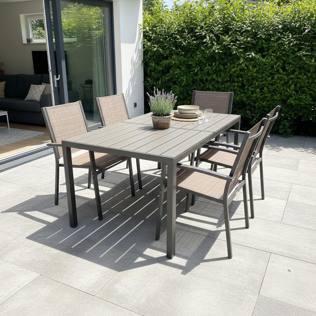 Kjo tavolinë elegante e jashtme me sipërfaqe me efekt druri kombinon stilin modern me funksionalitetin praktik për ambientet tuaja të jashtme.