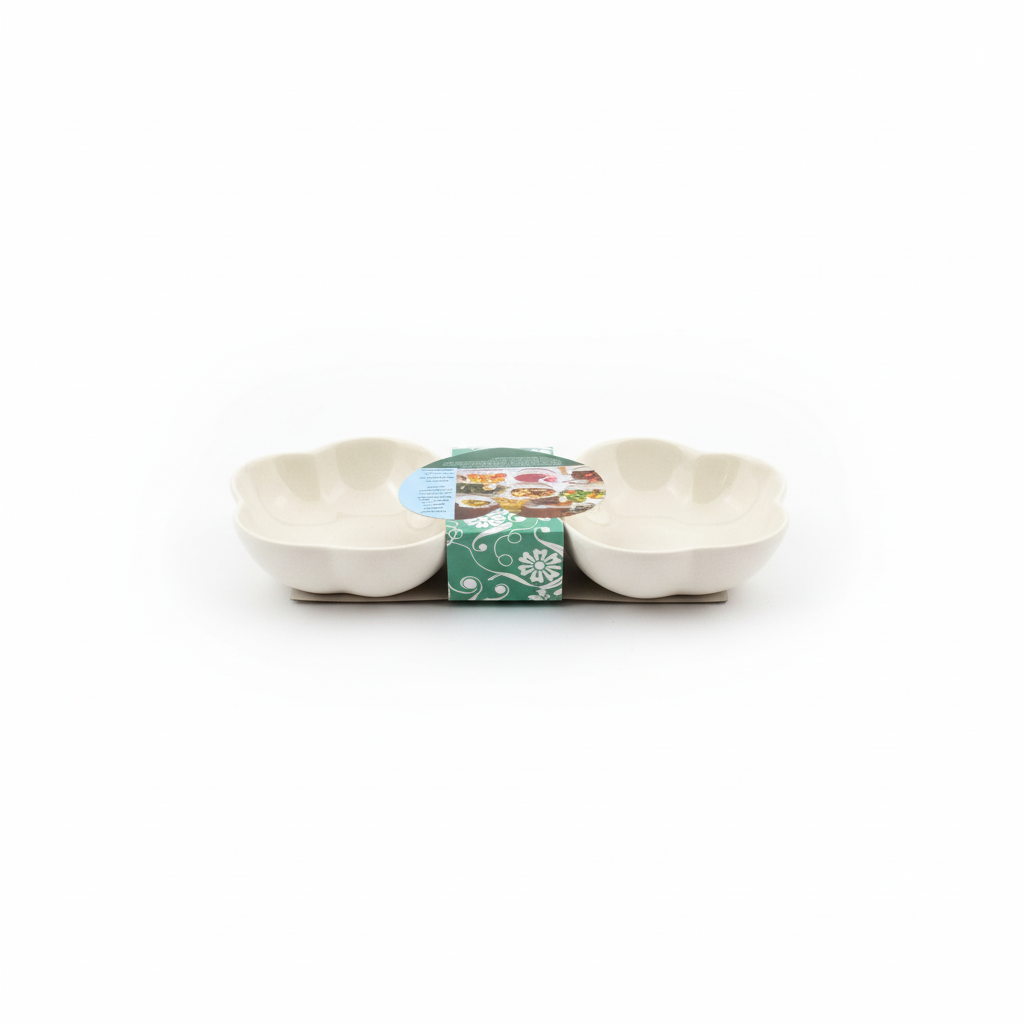Set me 3 enë të vogla qeramike të bardha, ideale për servirjen e mezeve, salcave dhe garniturave në çdo tryezë. Forma e harkuar, si petale lulesh, i jep një pamje elegante dhe dekorative.