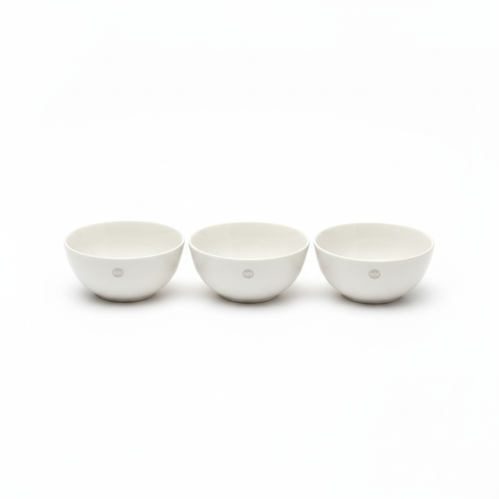 Set me 3 ena të vogla shërbimi në ngjyrë të bardhë, me formë rrethore, të përshtatshme për servirjen e snack-eve, ëmbëlsirave ose salcave. Vijnë të ambalazhuara në kuti transparente plastike, gati për përdorim ose dhuratë.