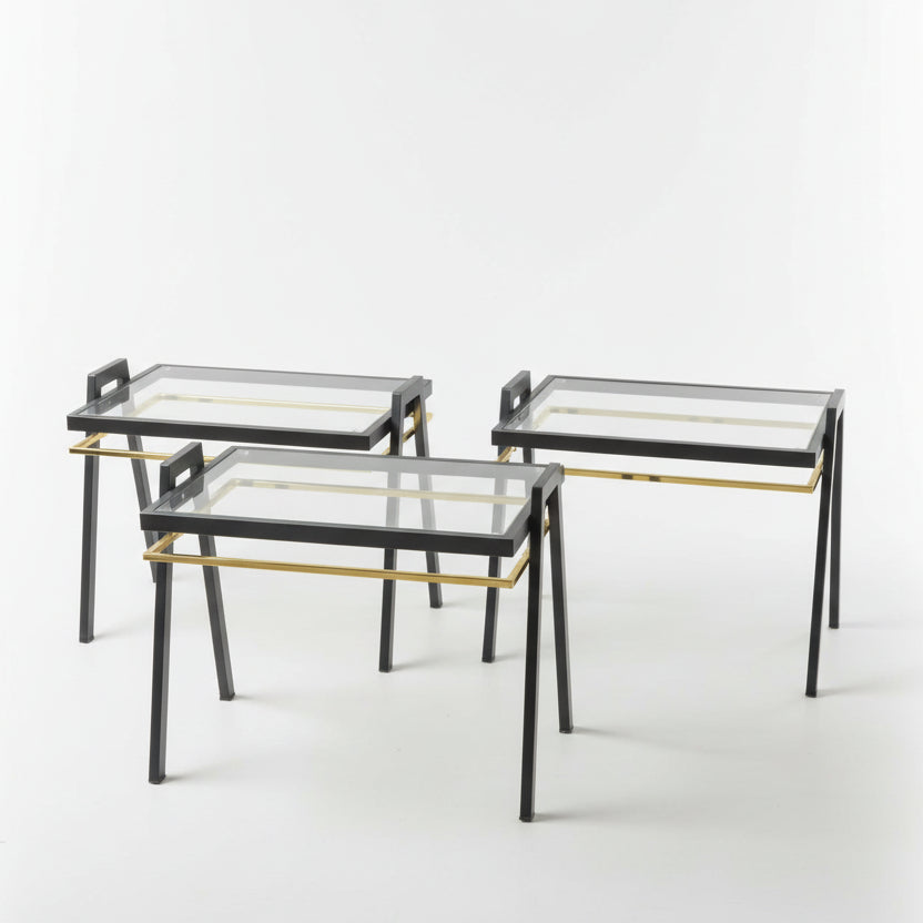 Ky set tavolinash anësore ka një dizajn elegant dhe modern, duke përdorur një kombinim të metalit dhe xhamit. Baza metalike e ngjyrës së errët dhe aksentet e arta e bëjnë këtë set tavolinash një shtesë të shkëlqyer për çdo dhomë, duke sjellë një ndjenjë të sofistikuar dhe luksoze.