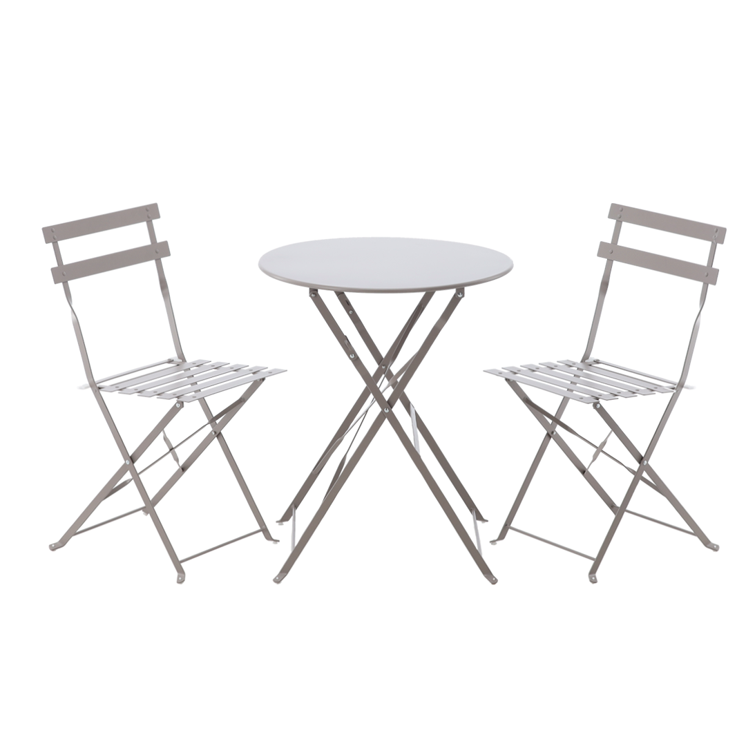 Forma rrethore e tavolinës krijon një ambient të këndshëm dhe praktik për kafe, mëngjes apo biseda të shkurtra, ndërsa dizajni palosës i karrigeve e bën setin të lehtë për ruajtje dhe transport.