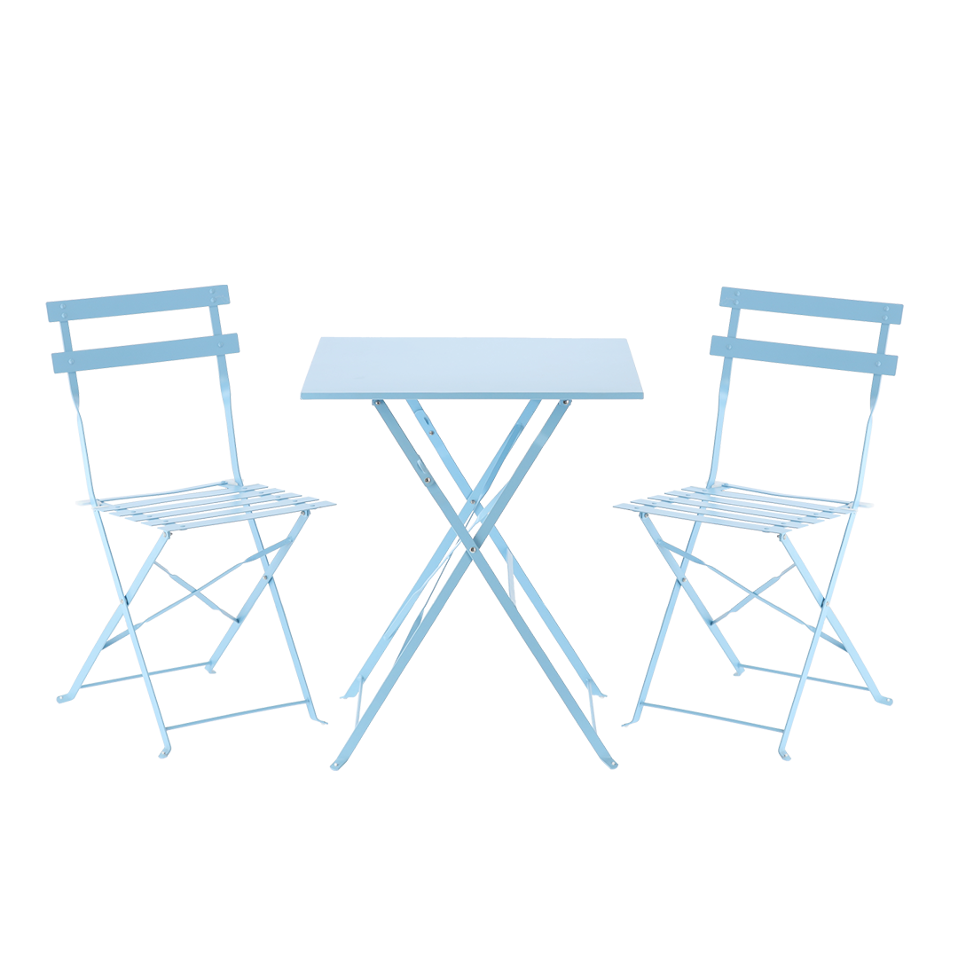 Ky set tavoline me 2 karrige në ngjyrë blu pastel sjell freski dhe stil në çdo ambient. Me dizajn minimalist dhe strukturë metalike të qëndrueshme, është zgjidhja ideale për ballkone, veranda apo hapësira të vogla në shtëpi.