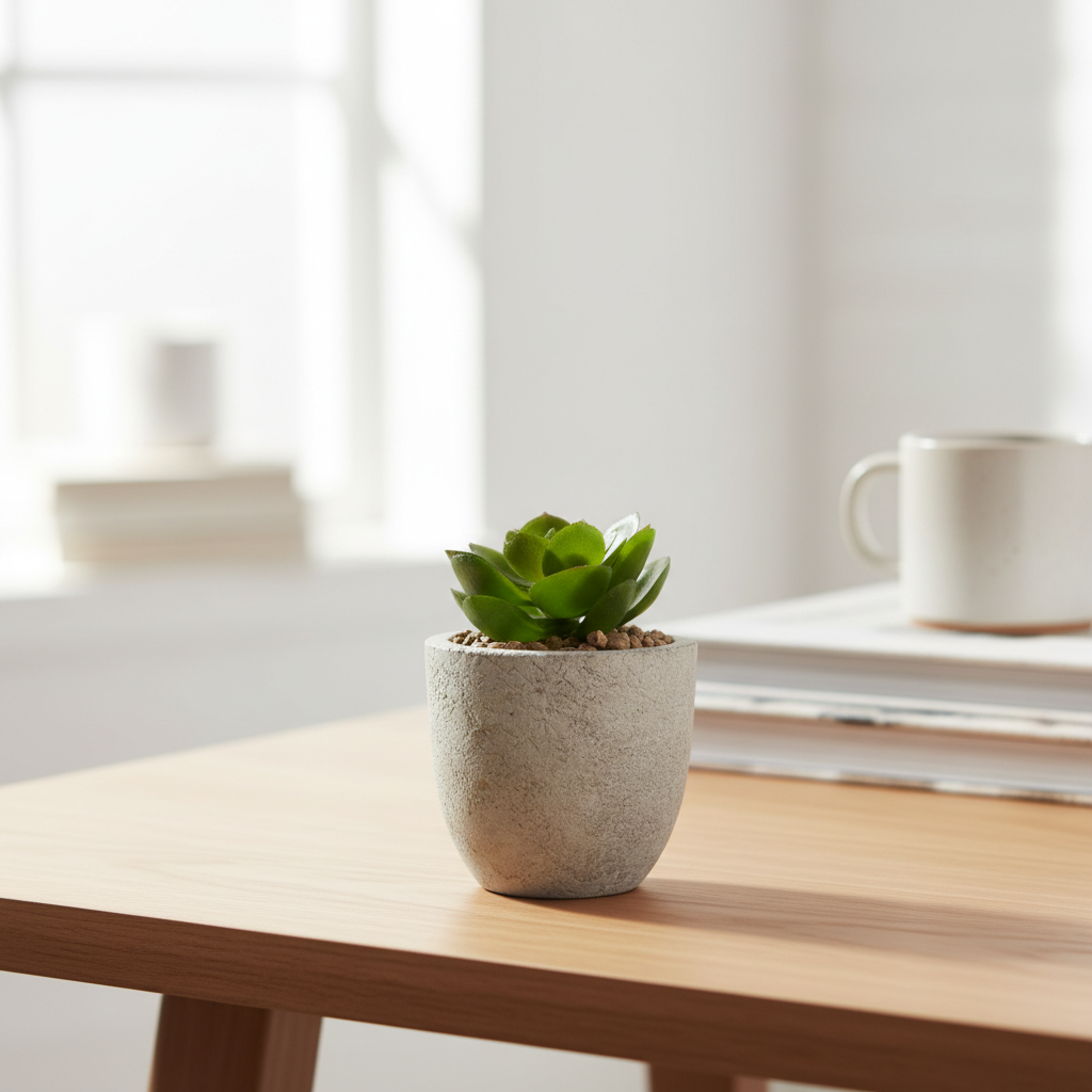 Kjo vazo e vogël dekorative me bimë artificiale në stil sukulente sjell gjelbërim të përhershëm në çdo ambient të brendshëm, pa nevojë për ujitje apo mirëmbajtje. Saksia gri me teksturë natyrale dhe sipërfaqja e zbukuruar me guralecë të vegjël dekorativë krijojnë një pamje moderne dhe elegante për tavolinë, raft ose zyrë.