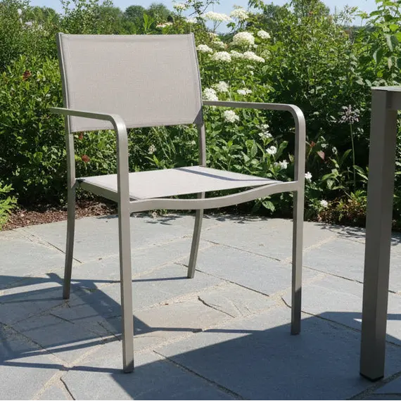 Kjo karrige elegante për ambiente të jashtme kombinon dizajnin minimalist me funksionalitetin, duke krijuar një zgjedhje perfekte për veranda, kopshte apo ballkone. Linjat e pastra dhe ngjyra neutrale e bëjnë lehtësisht të kombinueshme me çdo stil arredimi.