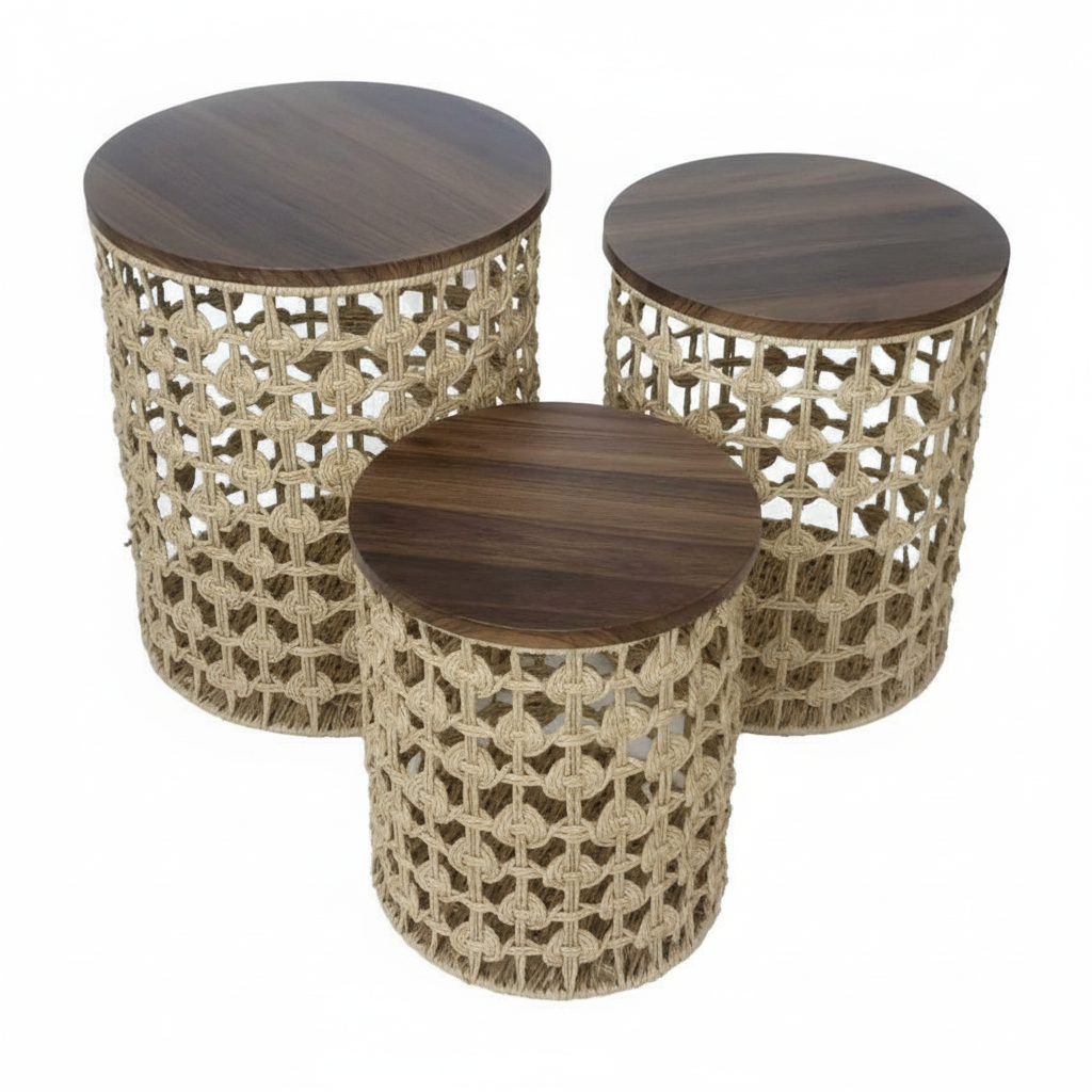 Set elegant me 3 tavolina anësore rrethore me bazë litari të gërshetuar dhe sipërfaqe druri me pamje natyrale. Ideale për arredim boho ose bregdetar, duke shtuar ngrohtësi dhe stil në çdo ambient.