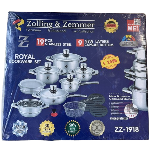 Zolling & Zemmer ZZ-1918 është një set tenxheresh premium i krijuar nga çeliku inox 18/10 kirurgjik, i cili garanton qëndrueshmëri, higjienë dhe jetëgjatësi. Me dizajn modern dhe fund të ri 9 shtresor të kapsuluar, ky set shpërndan nxehtësinë në mënyrë të barabartë duke kursyer deri në 50% energji.