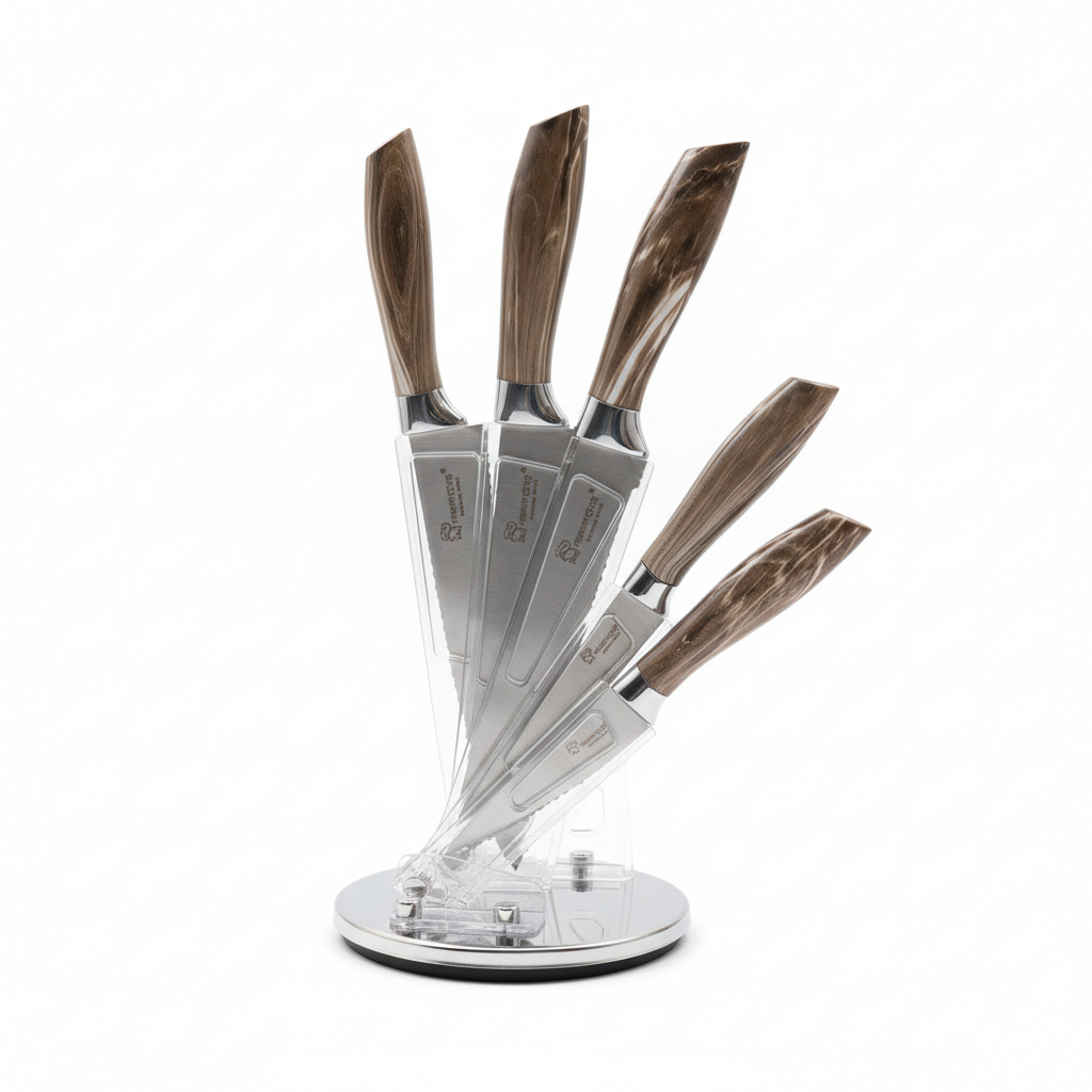 Ky set përmban 7 thika inoksi cilësore me doreza me efekt druri, të dizajnuara për përdorim të përditshëm në kuzhina shtëpie ose profesionale. Mbeshtetësja transparente me bazë rrotulluese siguron organizim të përsosur dhe akses të shpejtë në çdo thikë, ndërsa dizajni modern i jep stil banakut tuaj të punës. Materialet e qëndrueshme ndihmojnë në prerje të sakta dhe të sigurta për çdo lloj ushqimi.