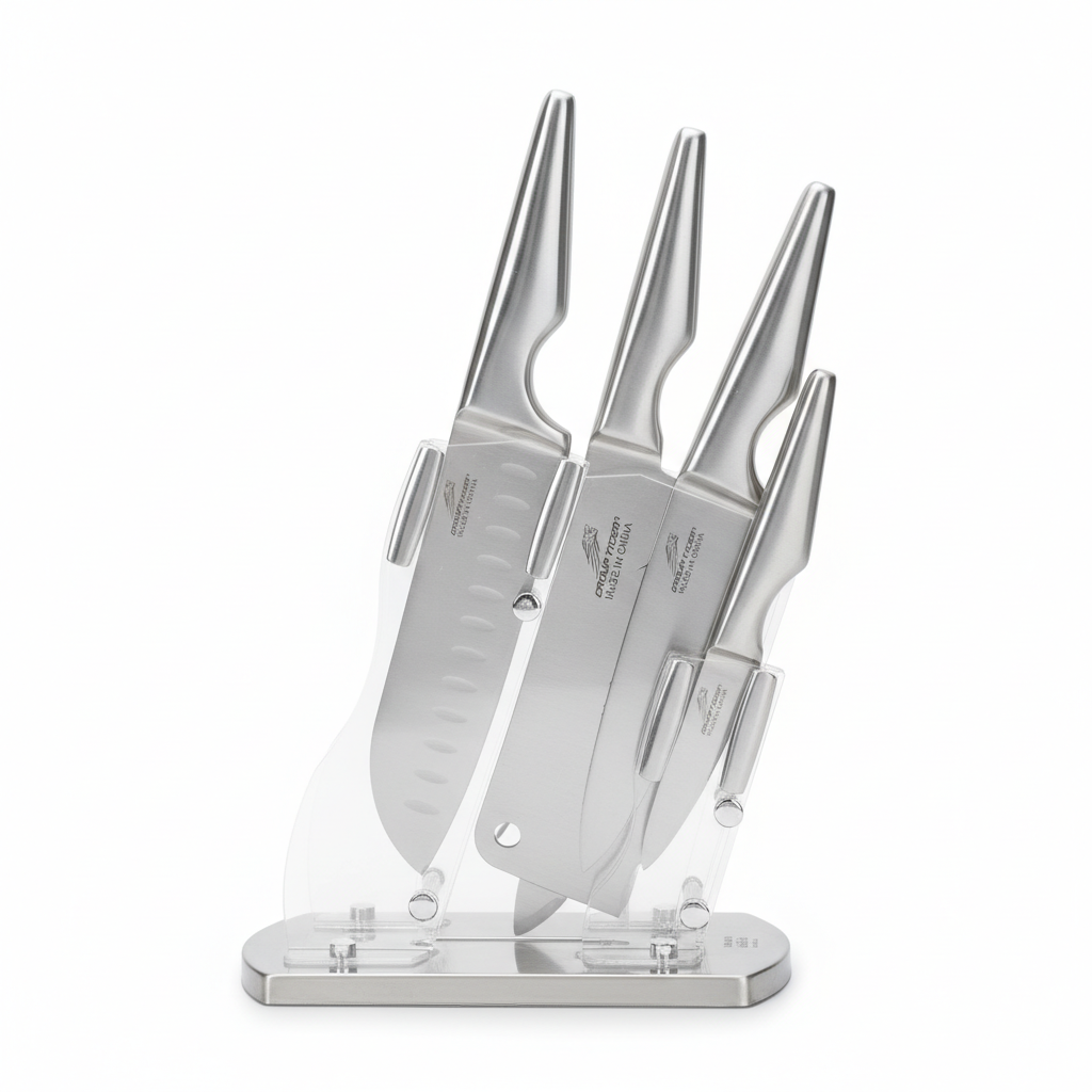 Ky set përfshin 5 thika funksionale kuzhine me dizajn modern dhe minimal, ideale për prerje të përditshme nga përgatitja e perimeve deri te mishrat. Tehu dhe dorezat janë të bëra nga çelik inox, duke ofruar qëndrueshmëri, mprehtësi afatgjatë dhe pastrim të lehtë. Kompleti vjen me një mbajtëse transparente akrilike që kursen hapësirë dhe i ekspozon thikat si element dekorativ në banakun tuaj.