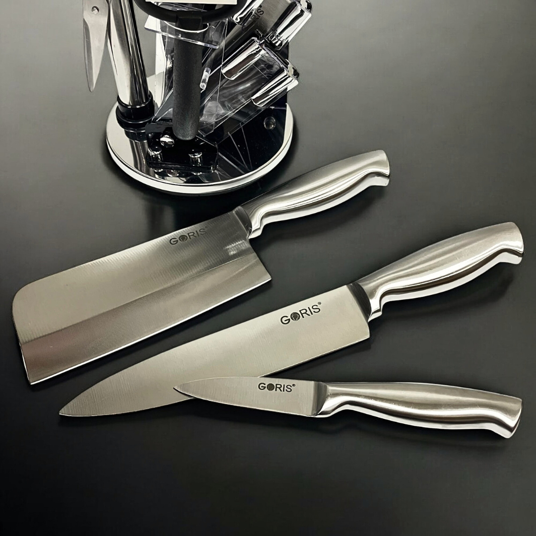 Kombinimi perfekt i dizajnit dhe prakticitetit, Set Thikash Majestic ka një thikë për çdo detyrë gatimi. Ky set me 8 pjesë përfshin: hanxhar, 4 thika profesionale, gërshërë kuzhine, qeruesen e patave, mprehësin e thikave, si dhe organizuesin modern të thikave. Seti Majestic i thikave prej çeliku inox ju jep tehe superiore me doreza të rehatshme. Cilësi profesionale dhe prerje me precizion të shkëlqyer.