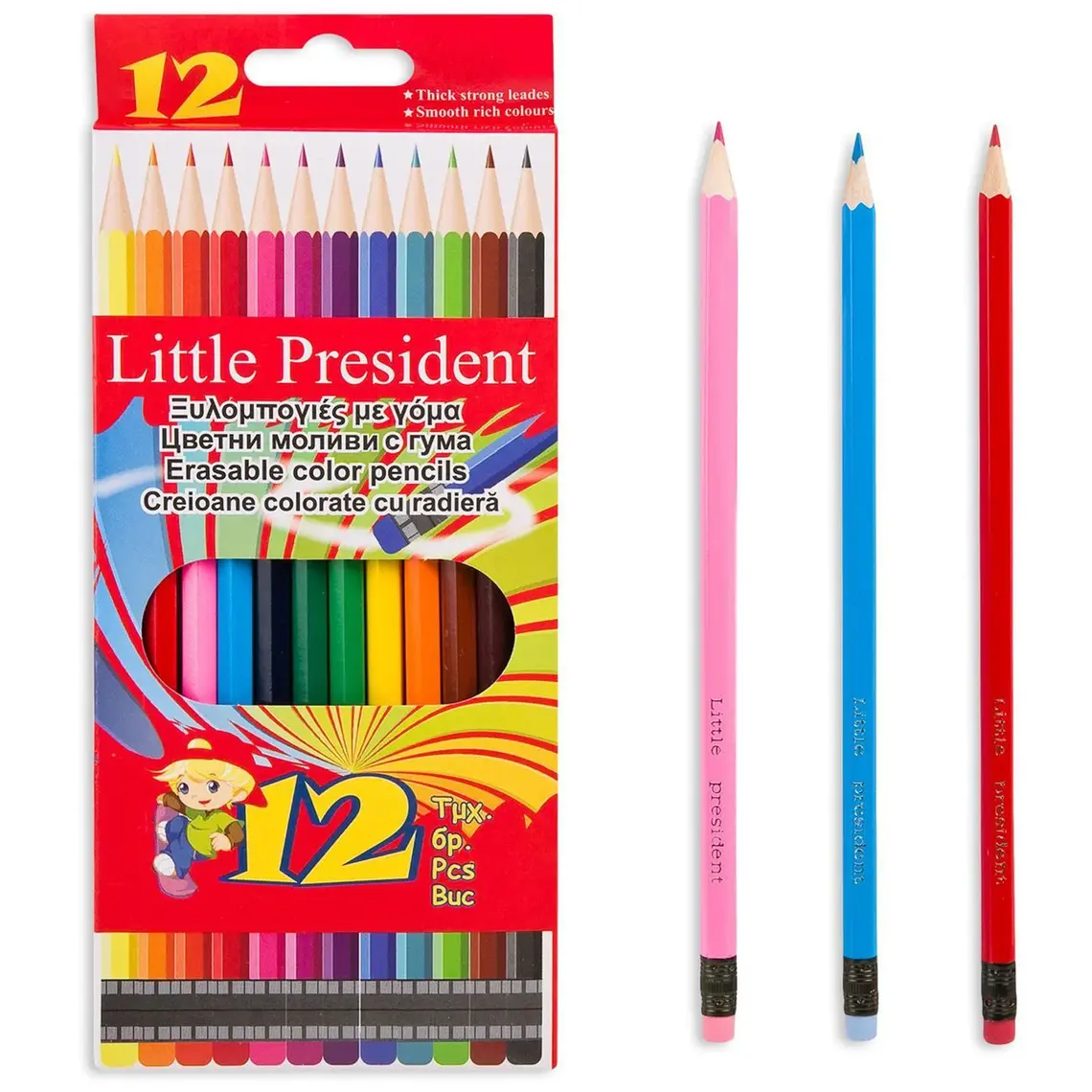 Paketa përmban 12 lapsa të hollë me ngjyra të ndryshme me gomë. Gjinia Djalë vajze Ngjyra Shumëngjyrësh Copëza 12 copë * KUJDES! Nuk është i përshtatshëm për fëmijët nën 3 vjeç.