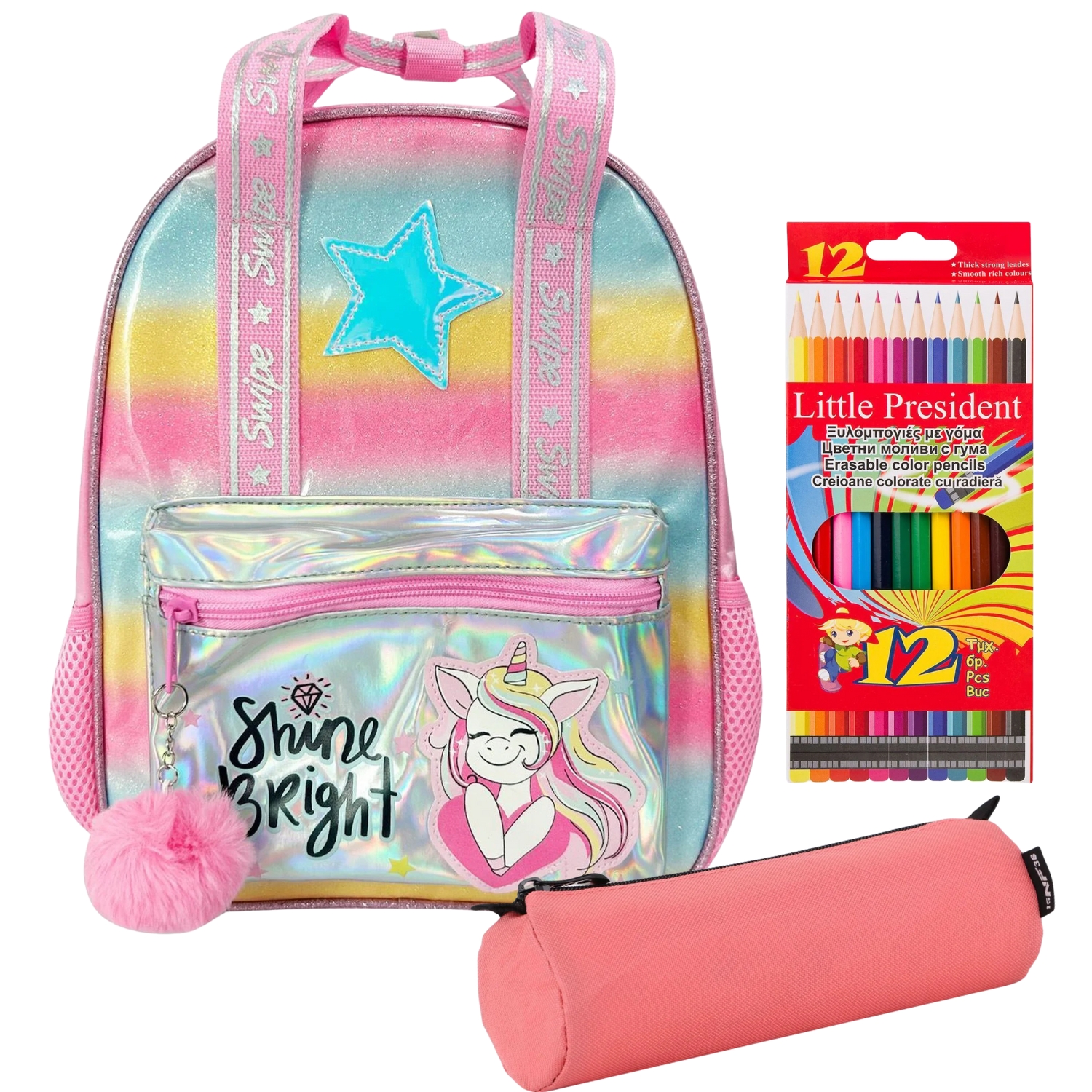 Seti shkollor 3 në 1: Çantë shpine, Kuletë, Lapsa me ngjyra